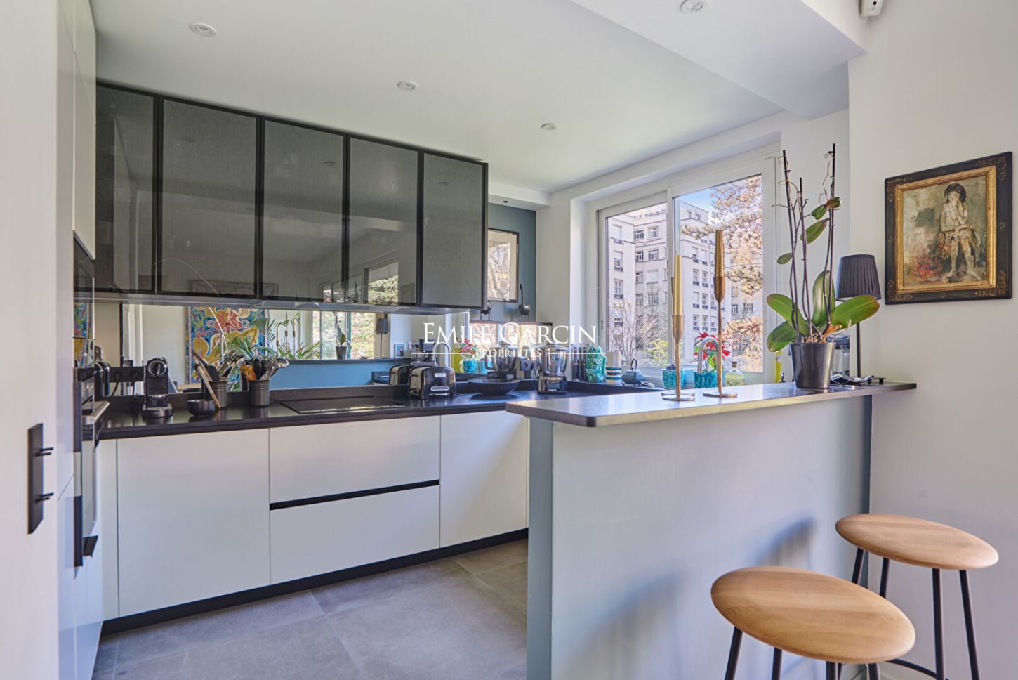 La cuisine, ouverte sur la pièce de vie et entièrement rénovée par une prestigieuse maison italienne, allie esthétisme et fonctionnalité et s'intègre harmonieusement à l'ensemble. Le parquet en chêne français souligne le caractère chaleureux et raffiné des lieux.