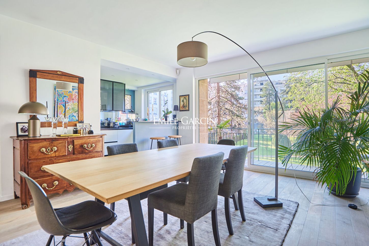 Dès l'entrée, agrémentée de rangements intégrés, l'appartement séduit par ses volumes généreux et sa distribution fluide. La pièce de vie, spacieuse et traversante, bénéficie d'une double exposition lui conférant une luminosité remarquable tout au long de la journée. De larges baies vitrées s'ouvrent sur un agréable balcon, véritable prolongement de l'espace de réception, offrant une vue dégagée sur un parc arboré, sans vis-à-vis, dans un environnement particulièrement calme.