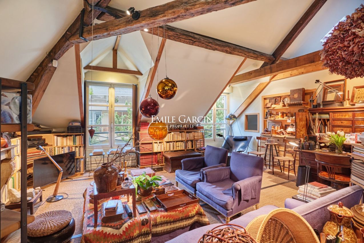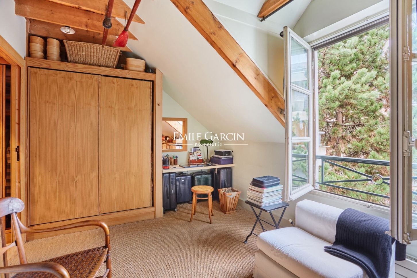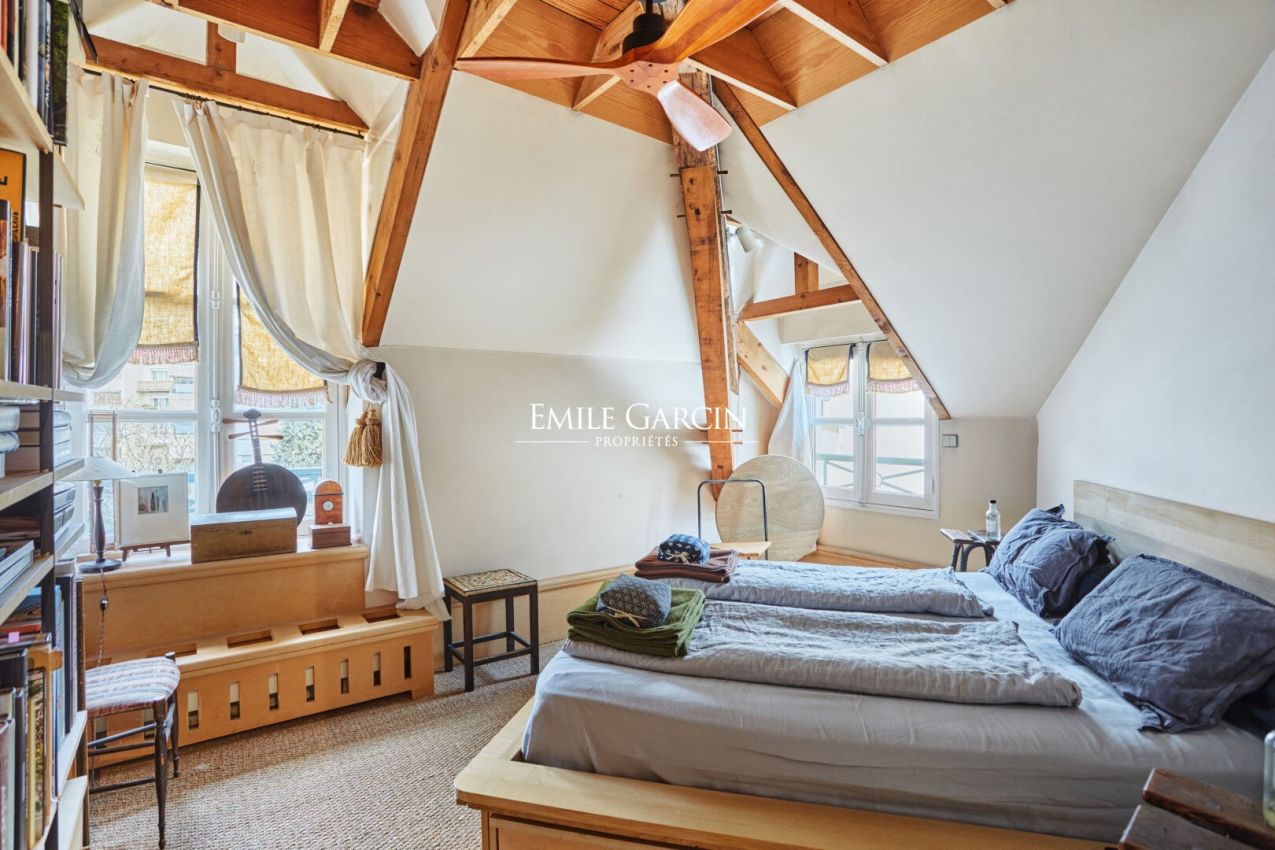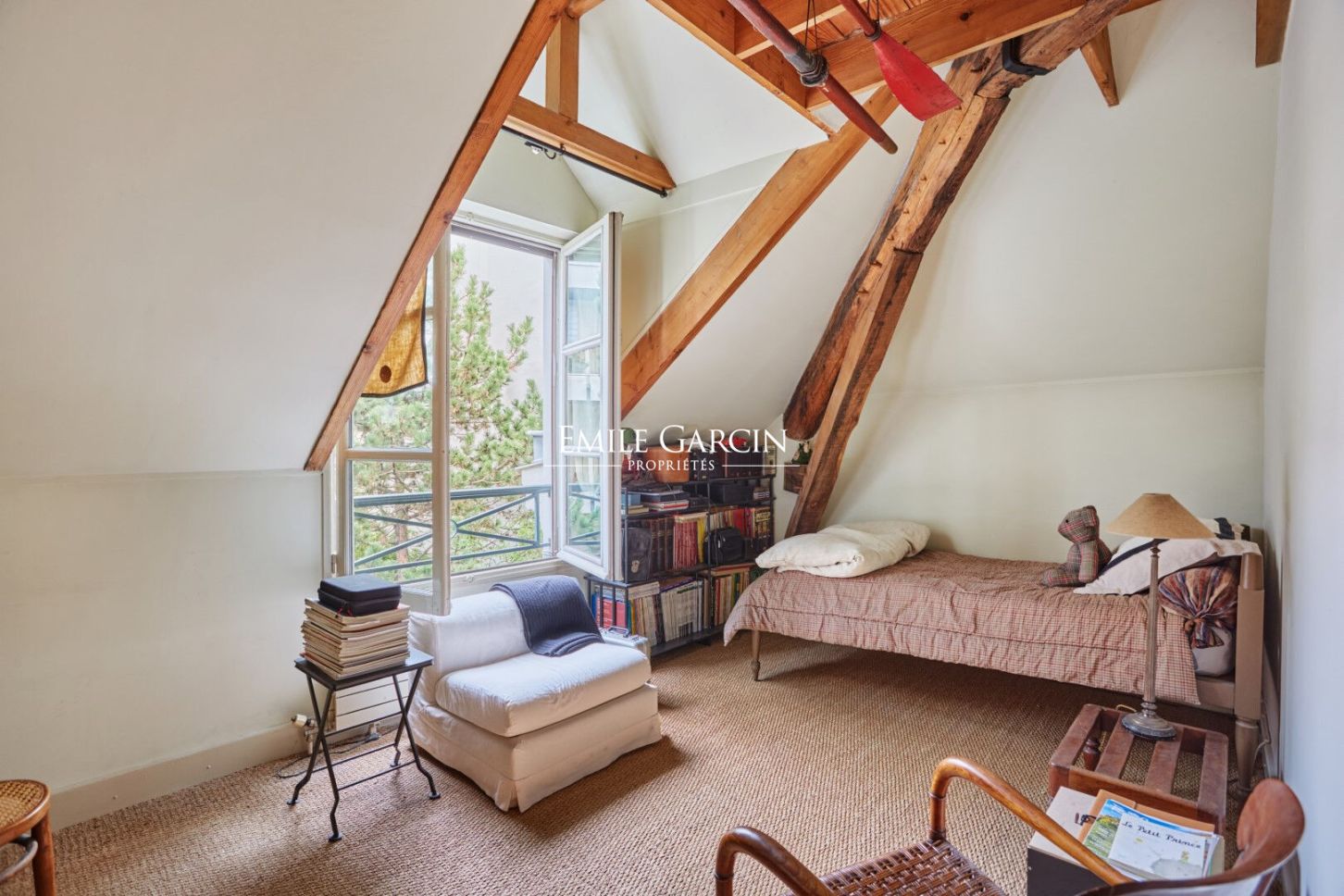A vendre, Neuilly Longchamp proche du Pont de Neuilly, dans une ravissante maison ancienne sur 3 niveaux, Magnifique appartement de 112 m² Loi Carrez (158m² au sol) situé au 2ème et dernier étage comprenant une entrée, un séjour double de 60m² avec cheminée et hauteur sous plafond, une cuisine indépendante, 2 chambres, 2 salles de bains, 2 wc. De nombreux rangements sur mesure. Cet appartement bénéficie d'une mezzanine de 39m² accessible par un escalier en bois. Ambiance chalet et verdure. Un double parking en sous-sol et une cave complètent ce bien rare à la vente. Belle hauteur sous plafond, poutre apparente, calme, clair, soleil et verdure. Beaucoup de charme.