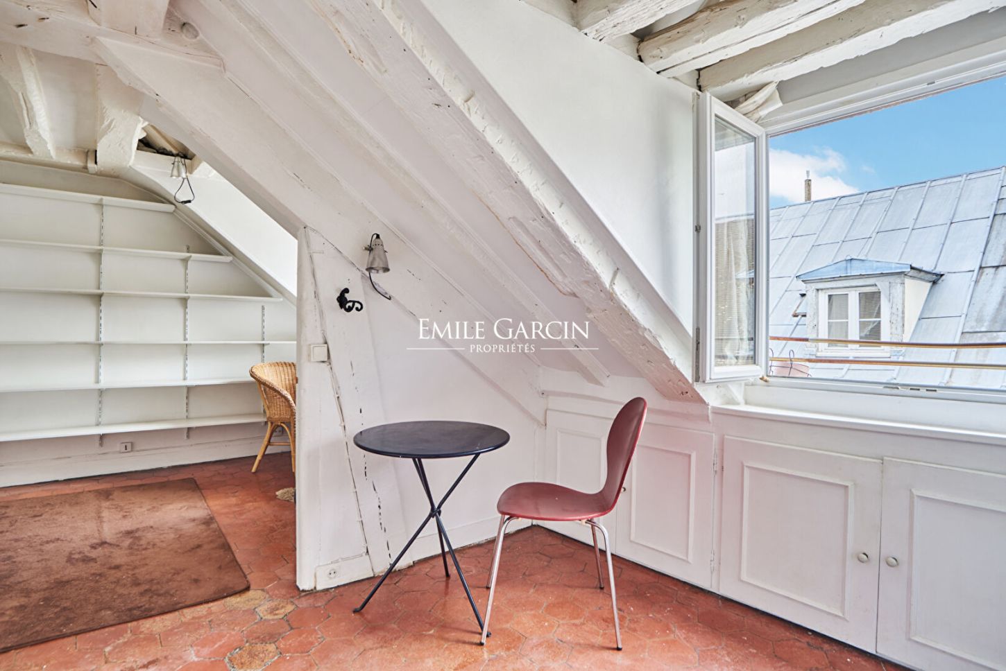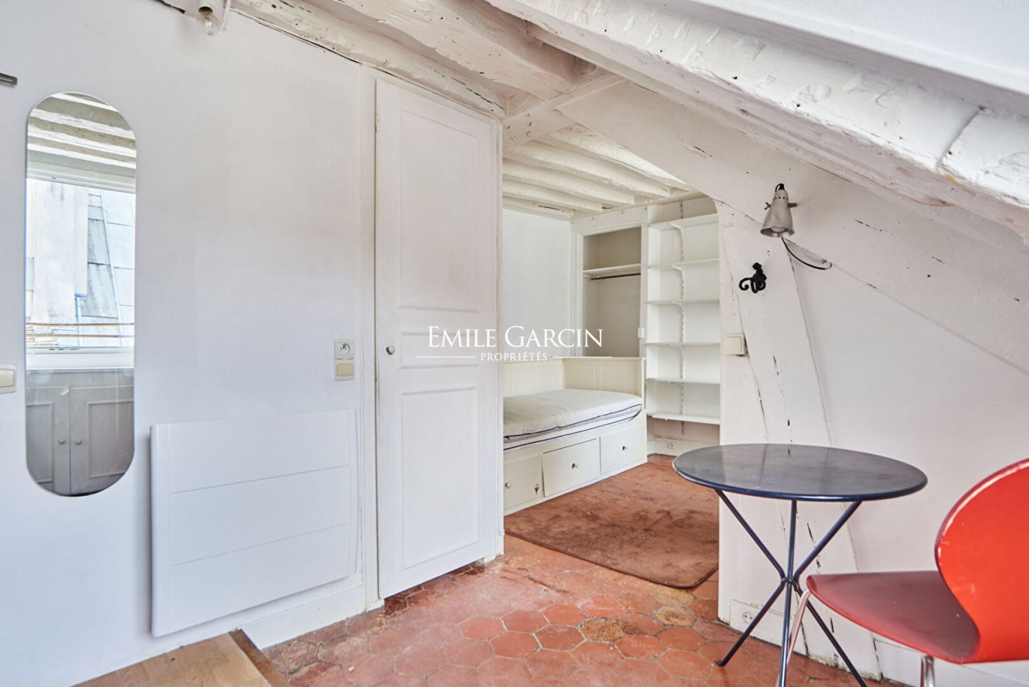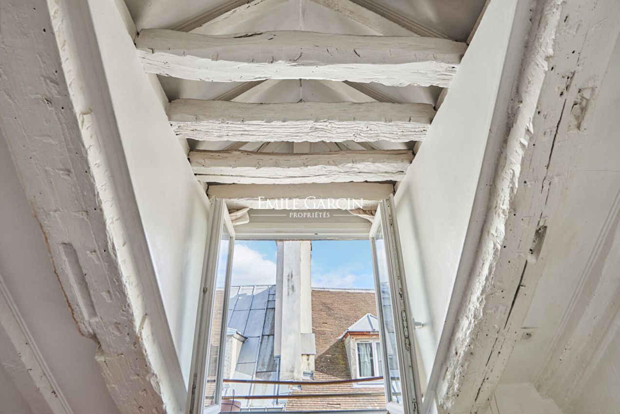 A deux pas de la célèbre Place des Vosges, niché au sixième étage sans ascenseur d'un immeuble ancien cet appartement de charme de 19 m² au sol (14,38m² loi Carrez) se compose d'une pièce principale, cuisine séparée, rangements, salle d'eau avec WC et local vélos. Ses poutres d'époque préservées, ses tomettes et ses deux fenêtres. Au calme. Commerces et transports à deux pas. Parfait pour un pied-à-terre authentique ou investissement en plein centre de Paris.