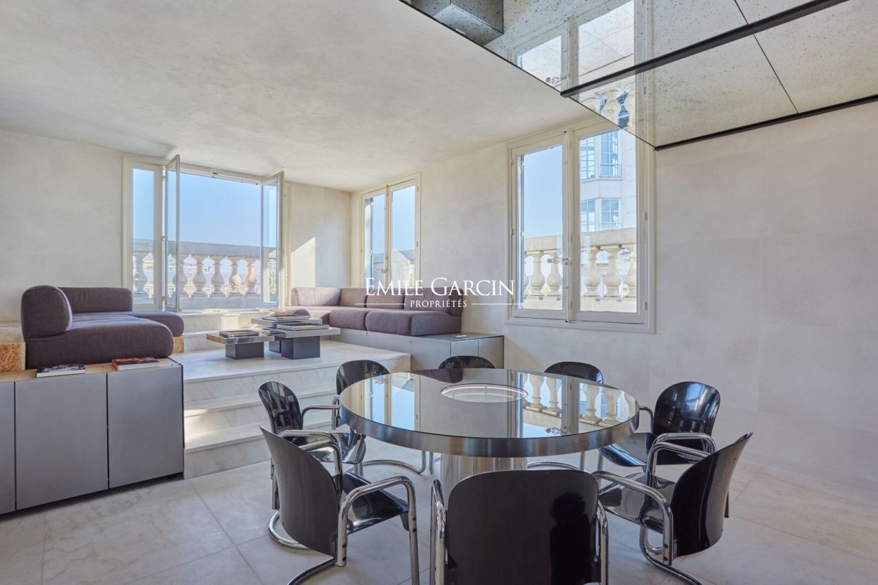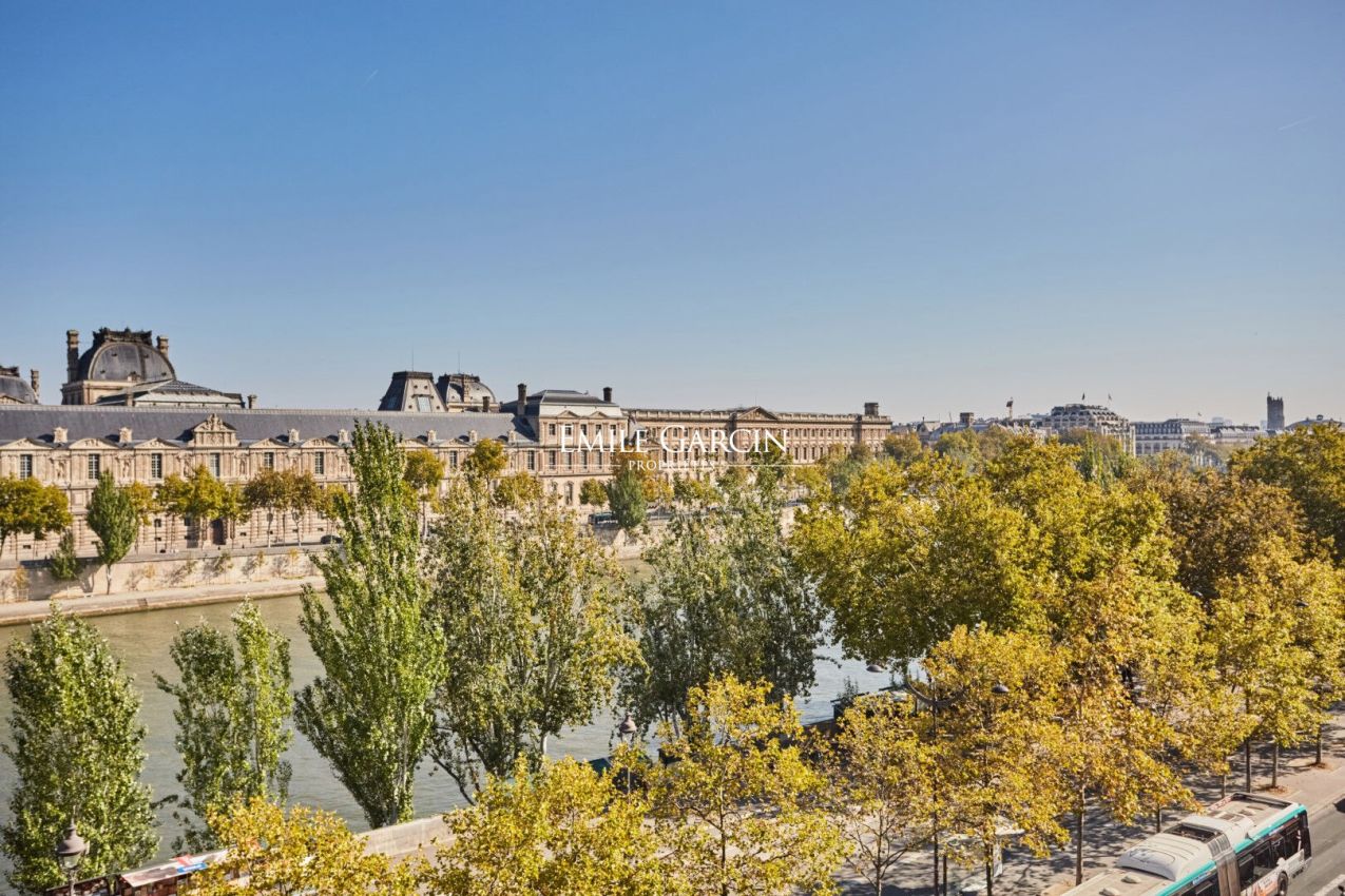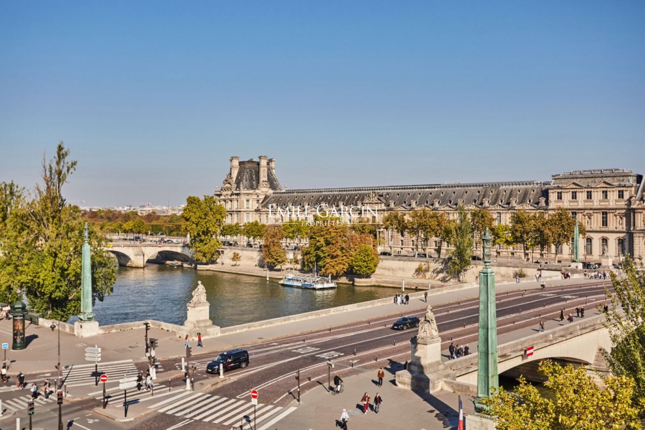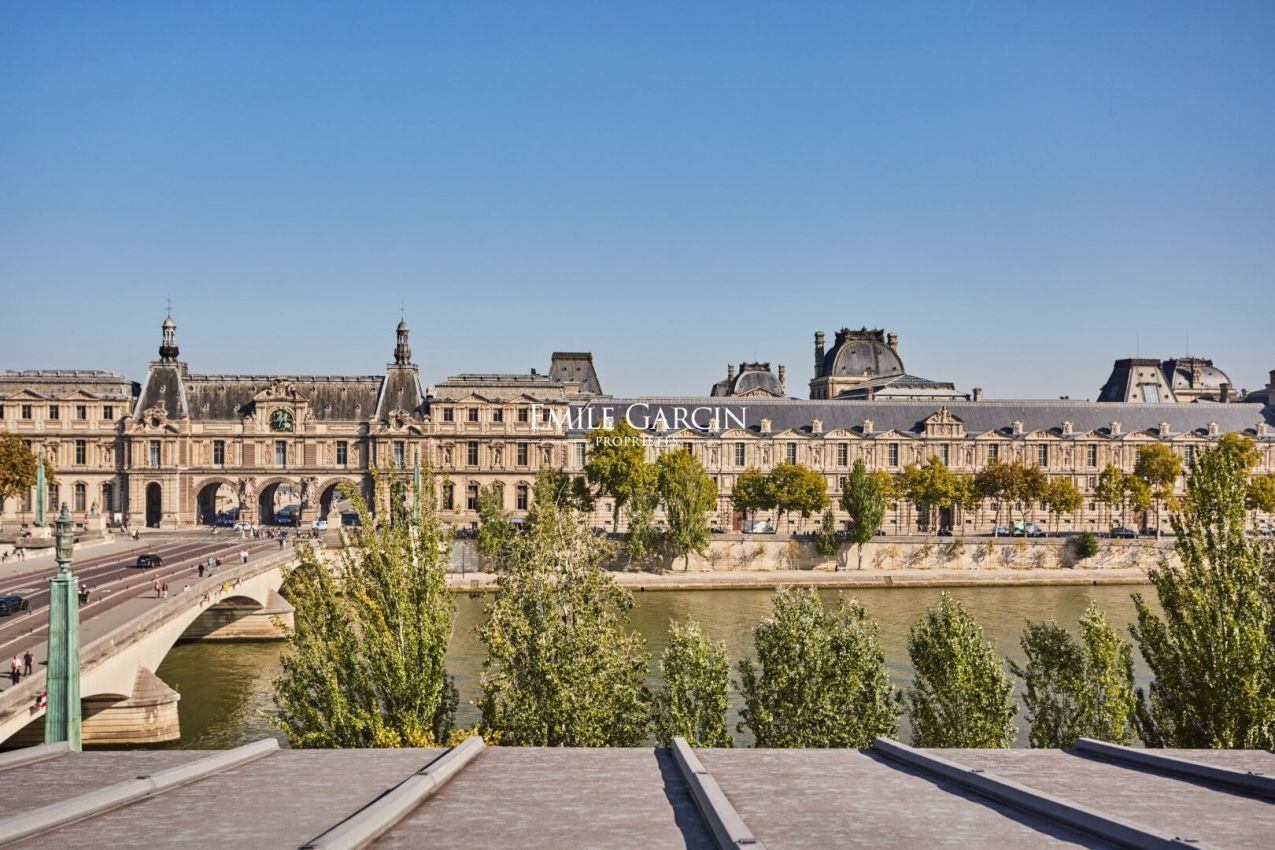 Quai Voltaire - Dans un magnifique immeuble sur les quais de la Seine, en face du mussée du Louvre, duplex en parfait état de 164.07 loi Carrez m² aux 4e et 5e étages par ascenseur. Cet appartement d'exception se compose au premier niveau d'une entrée, un vestiaire invité, un salon-salle à manger avec balcon de 19.01 m², une cuisine ouverte entièrement équipée et aménagée et des toilettes d'invités. Au deuxième niveau, deux suites avec des terrasses d'une surface de 7.58 m² et 7.55 m² avec vues sur les toits de Paris. Une place de parking complète ce bel ensemble. Gardien à demeure. (4.17 % honoraires TTC à la charge de l'acquéreur.) Copropriété de 29 lots - dont 14 lots habitation.(Pas de procédure en cours).