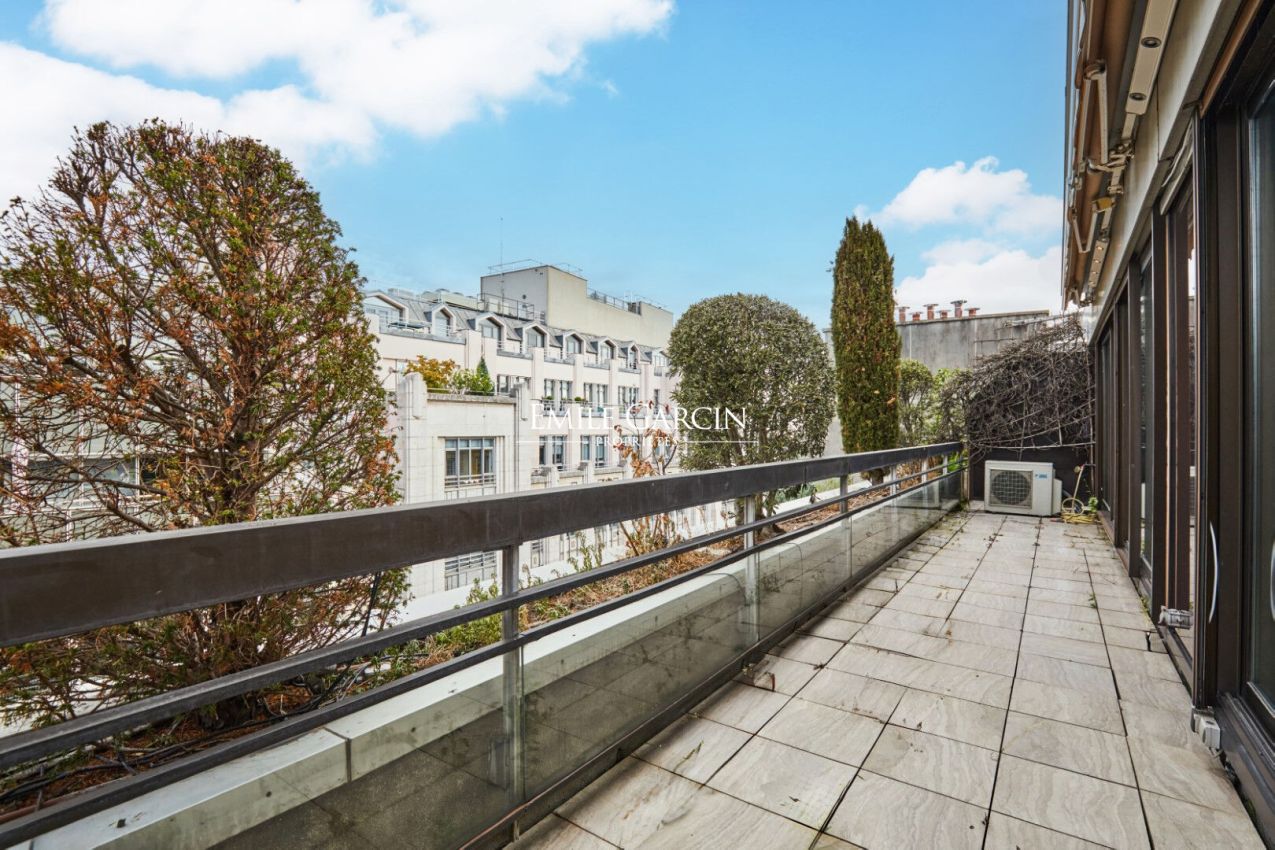 Paris 8ème arrondissement, à deux pas des Champs Elysées, pied à terre idéal situé au 7ème et dernier étage d'un immeuble des années 70, un appartement studio / loft de 47 m² environ avec une terrasse de 20 m². Entrée, pièce principale, cuisine entièrement équipée, salle de bains avec un WC, et coin TV. Climatisation. + Cave Copropriété de 329 lots.