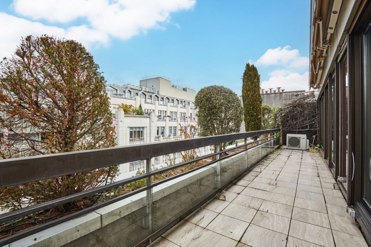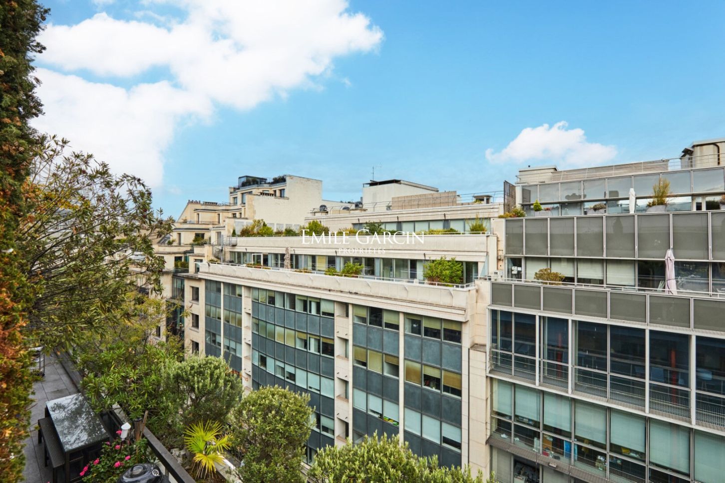 Paris 8ème arrondissement, à deux pas des Champs Elysées, pieds à terre idéal situé au 7ème et dernier étage d'un immeuble des années 70, un appartement studio / loft de 47 m² environ avec une terrasse de 20 m². Entrée, pièce principale, cuisine entièrement équipée, salle de bains avec un WC, et coin TV. Climatisation. Copropriété de 329 lots ().