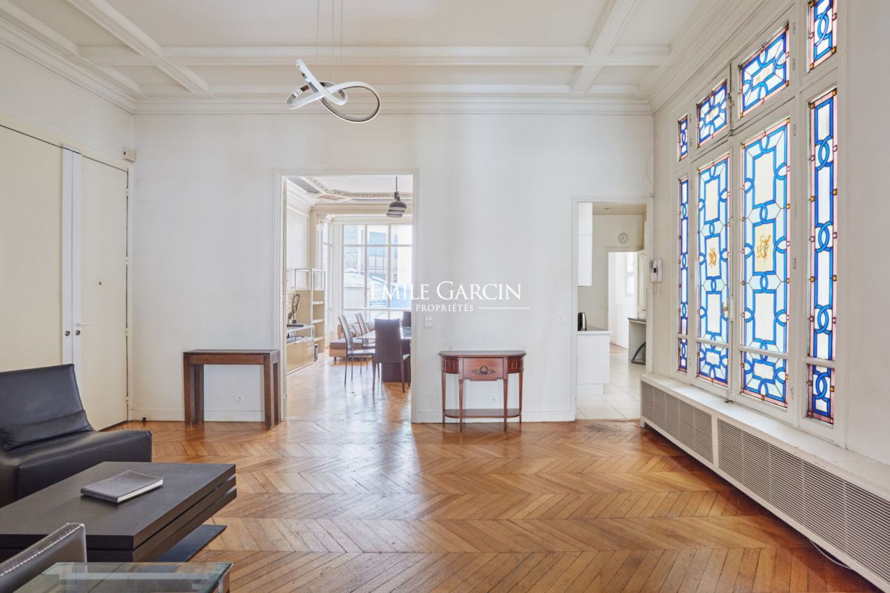Cet appartement situé au premier étage d'un immeuble Haussmannien de grand standing de 237 m² séduit par son charme classique et ses volumes généreux. Dès l'entrée, les grandes hauteurs sous plafond, les moulures d'époque, le parquet en pointe de Hongrie et le superbe Bow-window confèrent à ce bien une atmosphère chaleureuse. L'appartement se compose d'une galerie d'entrée, d'une double réception baignée de lumière, d'une salle à manger, d'une cuisine indépendante, de quatre chambres et de trois salles de bains. Le plan, à la fois fonctionnel et élégant, permet de distinguer les espaces de réception et la partie privée.