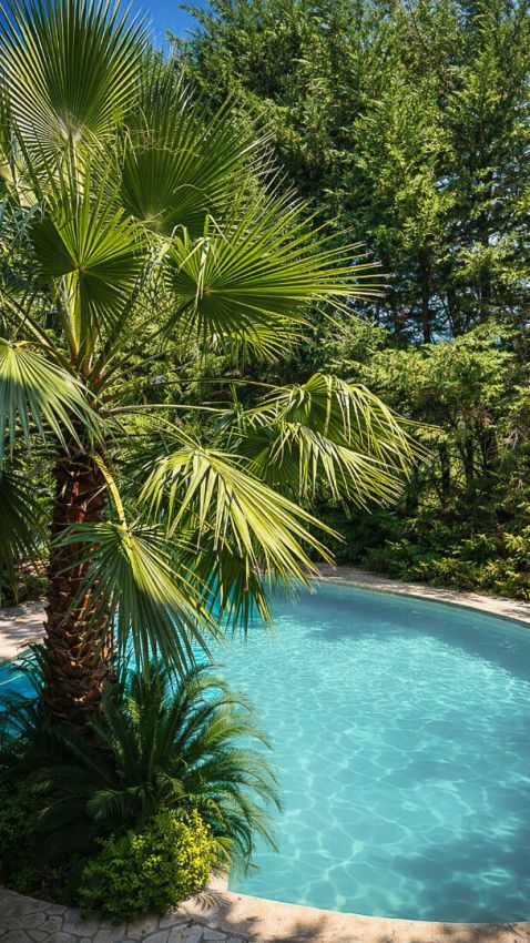 Le terrain d'environ 1 500 m² accueille une piscine paysagée parfaitement intégrée au jardin.