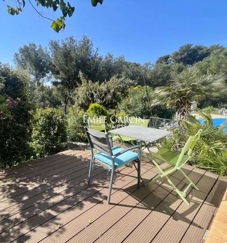 A Carry-le-Rouet, sur la Côte Bleue, cette spacieuse villa de 235 m² est située dans une résidence sécurisée, à seulement quelques minutes à pied de la mer. Nichée au coeur d'un jardin méditerranéen luxuriant de plus de 1 500 m², elle offre calme, intimité et confort. Dès l'entrée, le rez-de-chaussée dévoile un espace lumineux et fonctionnel avec deux chambres de plain-pied, une salle de bain, puis, après quelques marches, un vaste salon baigné de lumière, ouvert sur une grande terrasse avec vue mer. La cuisine semi-ouverte, entièrement équipée, donne également accès à l'extérieur grâce à une porte vitrée. A l'étage, l'espace nuit se compose de deux chambres, d'une salle de bain, d'une suite parentale, ainsi que d'une alcôve avec balcon. Le rez-de-jardin, accessible de façon indépendante, accueille deux chambres supplémentaires, chacune avec sa propre salle de bain et terrasse privative, idéal pour recevoir ou envisager une activité d'accueil. A l'extérieur, le jardin en restanque s'épanouit dans une végétation méditerranéenne généreuse. Il propose plusieurs espaces de détente : un terrain de pétanque ombragé, une piscine traditionnelle, de larges terrasses et de beaux espaces verts répartis sur différents niveaux. Un garage de 20 m² vient compléter ce bien aux nombreux atouts.