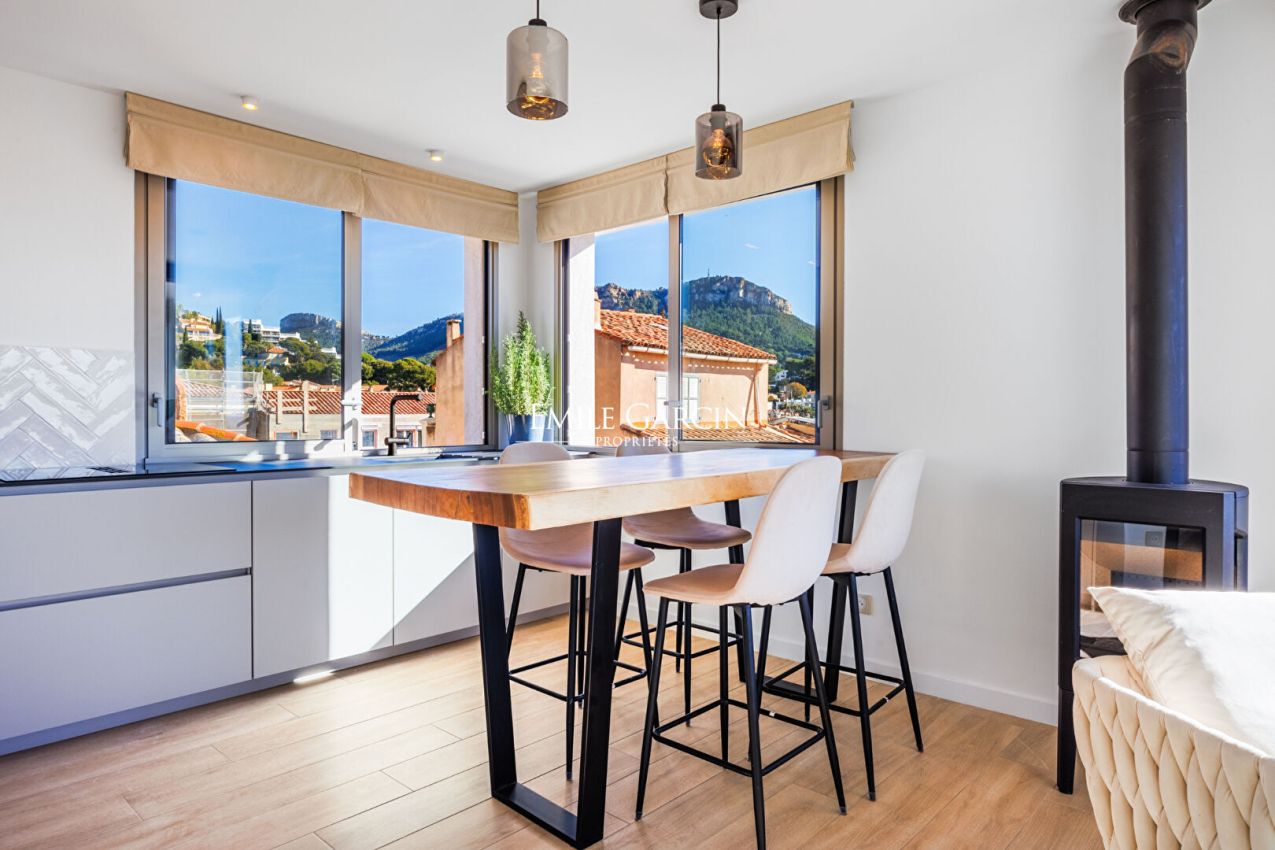Situé au coeur du centre historique de Cassis dans une rue piétonne, cet appartement de 94 m2, entièrement rénové se situe à deux pas du Port. Cet appartement de 5 pièces bénéficie d'un panorama à 360° sur la mer, le port, le Château, et le Cap Canaille depuis son magnifique rooftop de 49 m². Elevé au deuxième et troisième étage de l'immeuble, le duplex est desservi par un ascenseur sécurisé qui donne accès directement aux deux étages. Le premier niveau compte trois chambres avec placards de rangement, une salle de bain et toilettes séparés. Au troisième et dernier étage se développent une pièce de vie lumineuse regroupant salon avec un poêle à bois, salle à manger et cuisine ouverte, équipée et aménagée. Une chambre supplémentaire avec placards et une salle d'eau avec toilettes complètent cet étage. Au sommet de l'immeuble on découvre un rooftop privatif à la vue exceptionnelle sur le village et la méditerranée. Possibilité d'acquérir un garage dans l'immeuble en sus.