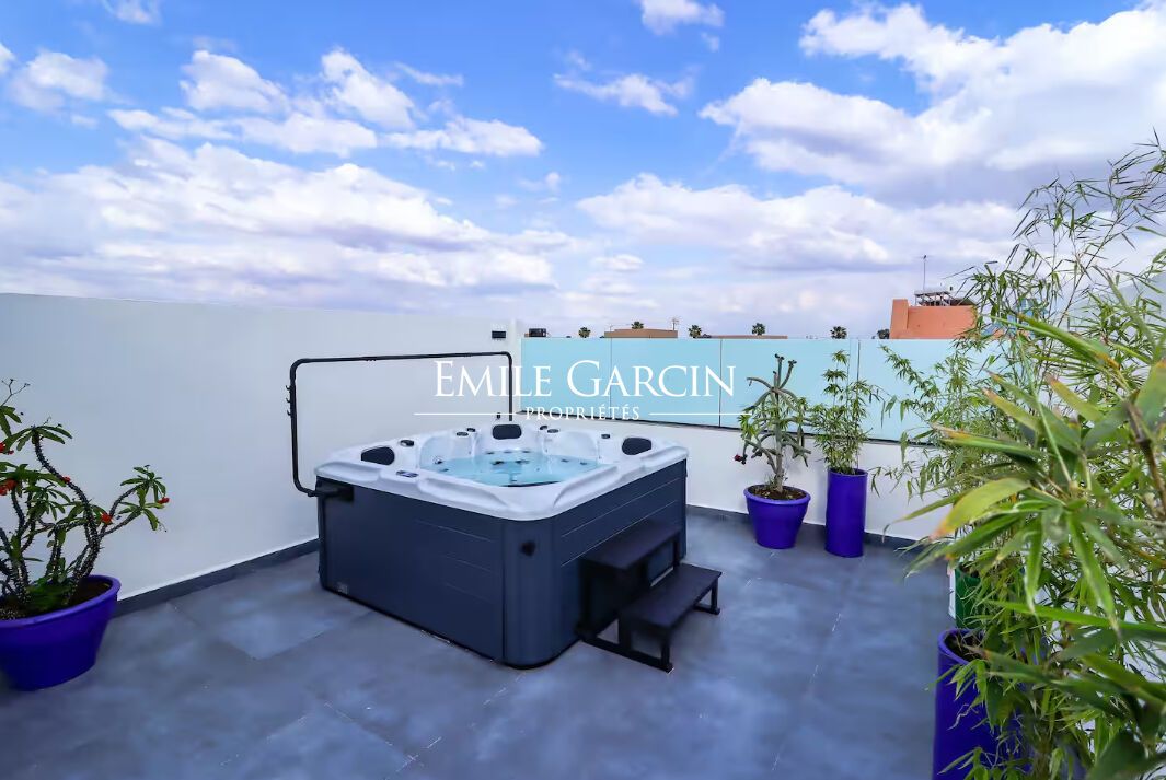 Duplex de 90 m² habitable et 40 m2 au sol, entièrement refait à neuf et situé dans le quartier recherché de Chrifia composé au Rdc d'un salon et d'une cuisine ouverte, au 1er étage belle chambre en suite avec sa salle de bain, terrasse aménagée avec un jacuzzi.