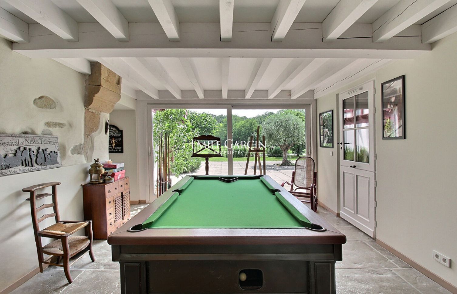 Une pièce avec billard ouverte sur la terrasse invite à la détente. Un escalier y prend place et mène à une chambre qui communique avec le reste de l'étage. A l'étage un élégant dégagement distribue trois suites généreusement dimensionnées, chacune avec sa propre salle d'eau.