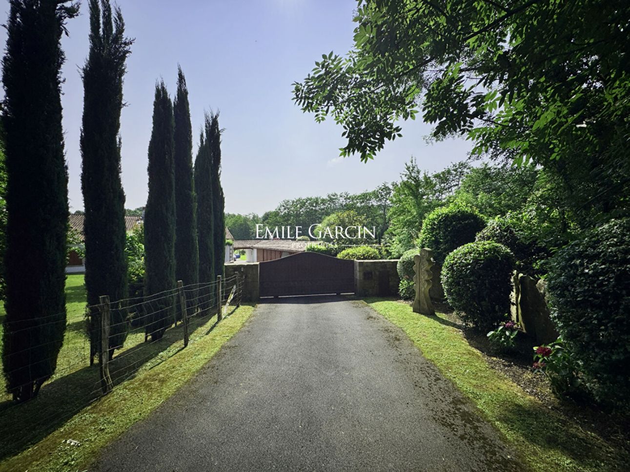 L'accès se fait par une allée bordée de cyprès qui conduit à un portail élégant, soulignant dès les premiers instants le soin apporté à chaque détail de cette propriété confidentielle.