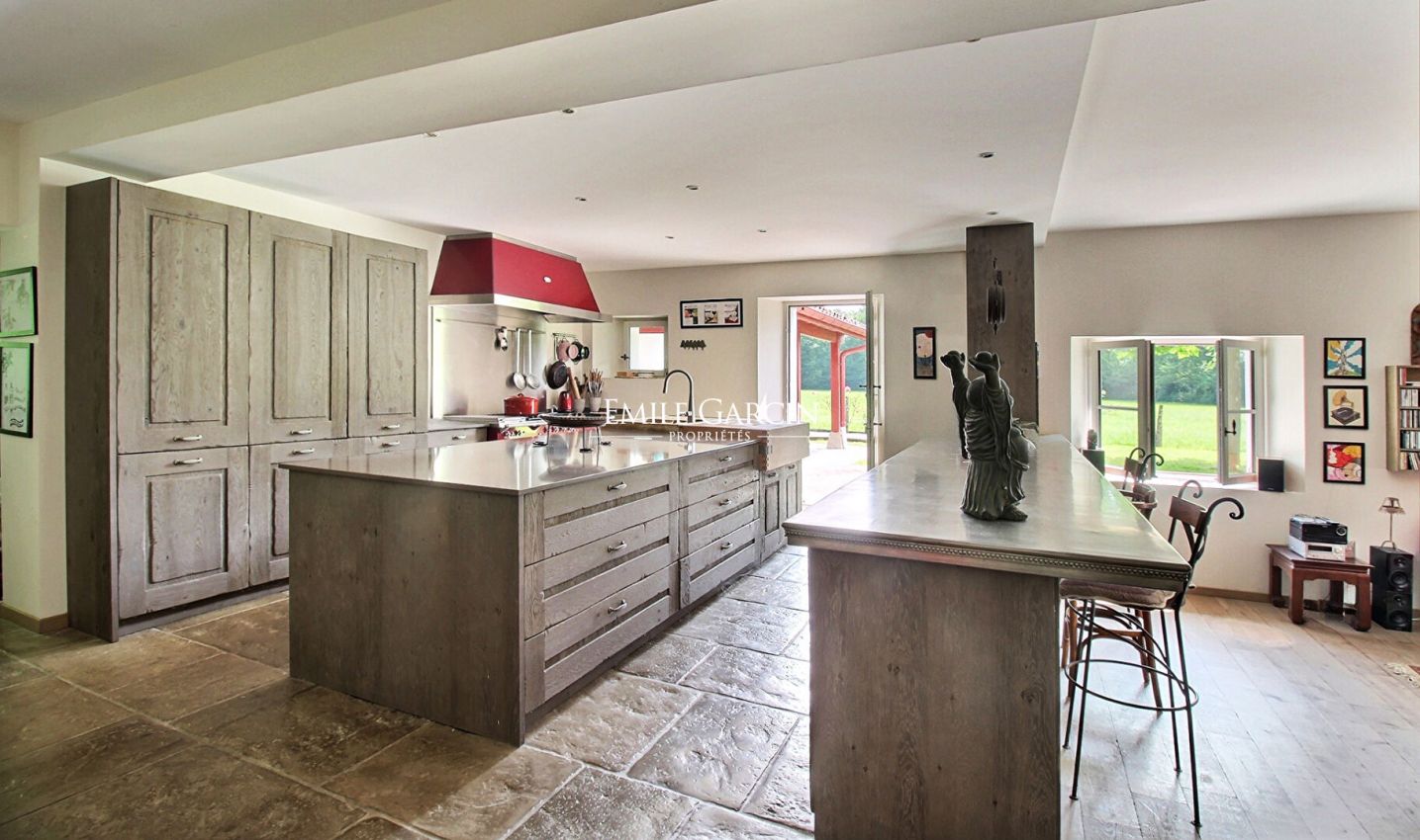 L'intérieur se veut chaleureux et familial, le grand salon avec cheminée s'ouvre sur une cuisine aménagée et équipée doté d'un large plan de travail, pensée pour recevoir et cuisiner dans un esprit de convivialité. Un espace repas avec une grande table s'inscrit dans cette même dynamique d'accueil. Un office s'ouvrant sur la terrasse ainsi qu'une pièce cave à vin viennent compléter cette partie de la maison.