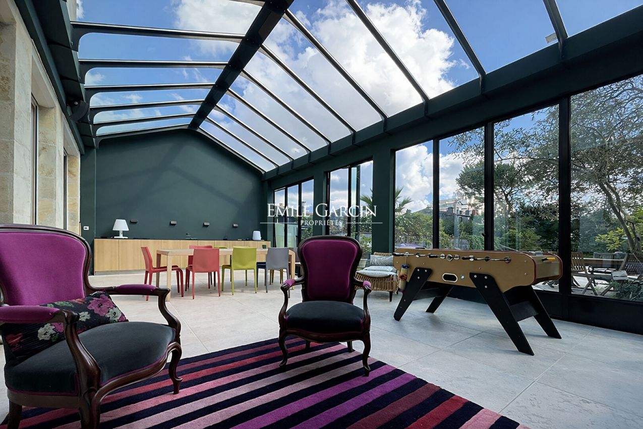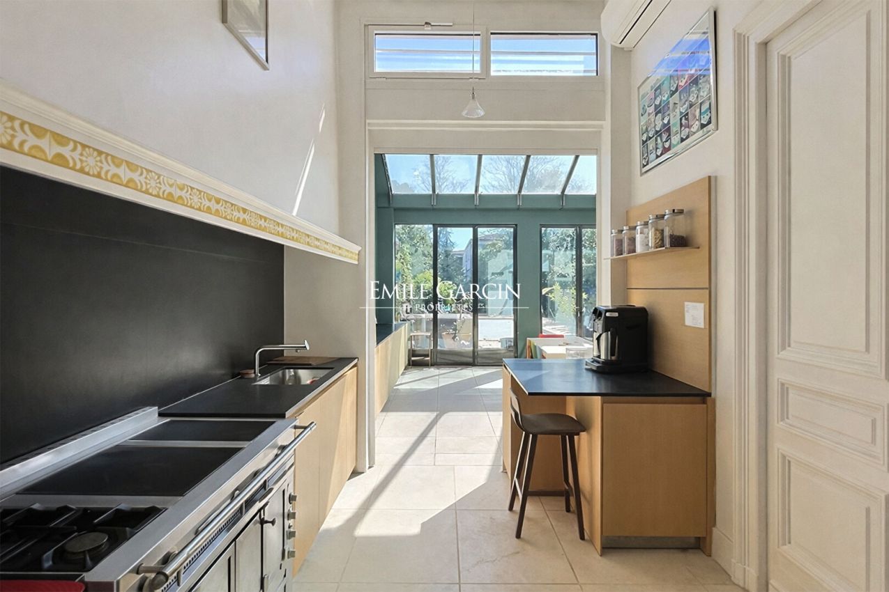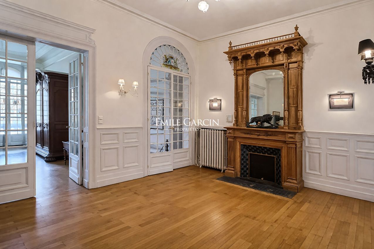 Dès les premiers pas, la maison d'environ 400 m² dévoile de vastes espaces de réception baignés de clarté naturelle, où le charme de l'ancien s'exprime pleinement à travers les parquets, les moulures et les cheminées. L'ensemble s'ouvre harmonieusement sur une véranda prolongée par un grand jardin et sa piscine, rare en ville, assurant un cadre de vie privilégié, au calme et à l'abri des regards.