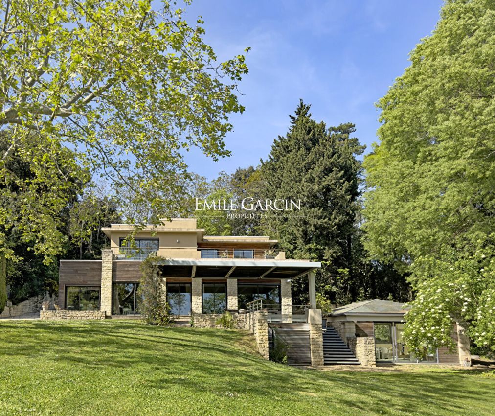 Nichée dans un environnement prisé et paisible, cette maison contemporaine d'architecte offre une vue imprenable sur la vallée du Rhône et la cité des Papes. Orientée sud-ouest, elle séduit par ses volumes lumineux, ses larges baies vitrées et sa parfaite ouverture sur le parc paysager. Le rez-de-jardin accueille un vaste espace de vie traversant avec cuisine équipée et îlot central, salon et salle à manger séparés par une cheminée centrale, le tout ouvrant sur une grande terrasse et le jardin. Lingerie, local technique (pouvant devenir cuisine d'été) et chambre avec salle d'eau complètent ce niveau. Cave en sous-sol. Une mezzanine surplombe le séjour et dessert une chambre avec salle de bains et vestiaire. A l'étage, deux suites disposent chacune de leur terrasse privative et salle d'eau ou de bains. Une vaste véranda aménagée en salon d'été abrite une ancienne source classée Monument Historique, offrant au lieu une touche patrimoniale unique.