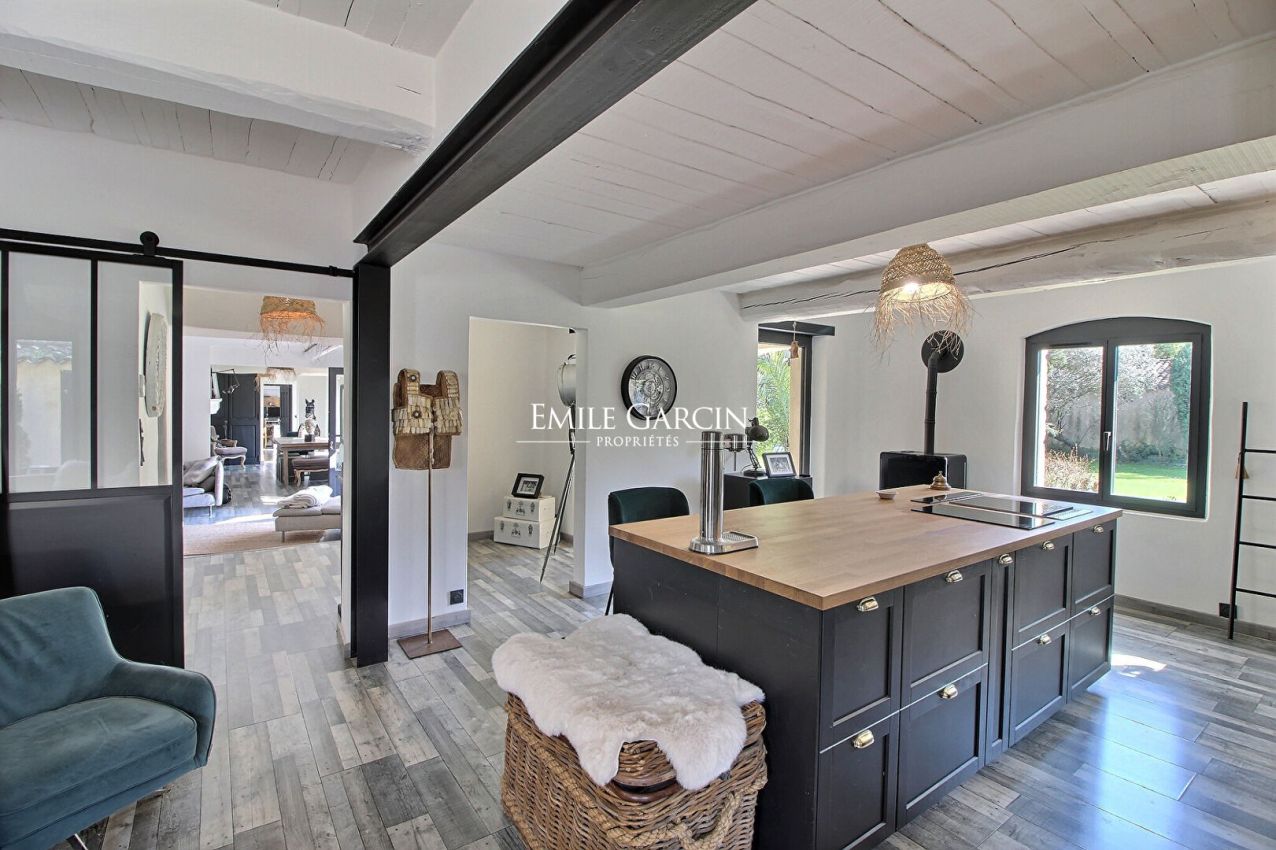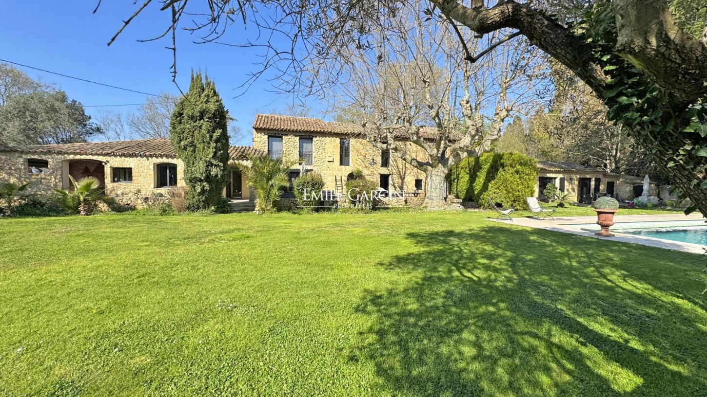 Située à proximité immédiate du village de Grans, à 30 minutes d'Aix-en-Provence, cette propriété pleine de charme bénéficie d'un environnement paysager, à l'abri des regards. Entièrement rénové, le mas présente en rez-de-chaussée une grande cuisine dinatoire, un salon, une salle à manger avec cheminée et un bureau, pouvant aisément être aménagé en chambre de plain-pied. A l'étage, vous découvrirez deux belles chambres, deux salles d'eau ainsi qu'un dressing. Une maison d'amis attenante et pouvant être ouverte sur la maison principale, présente de plain-pied une pièce de vie avec cuisine ouverte, une grande chambre et une salle d'eau. L'ensemble est très lumineux et bénéficie de tout le confort moderne. Le jardin, doté de très beaux arbres et d'une agréable piscine, est complété par plusieurs terrasses dont une grande terrasse couverte permettant de profiter de l'extérieur en toute saison.