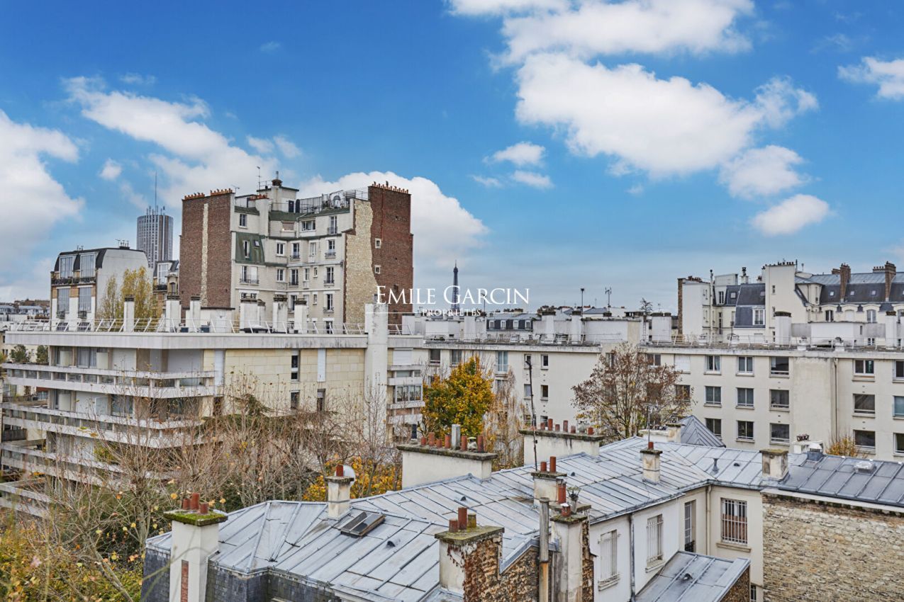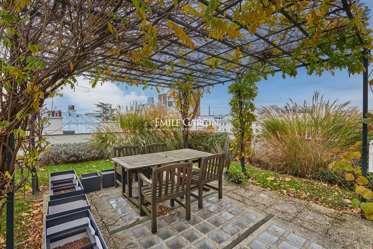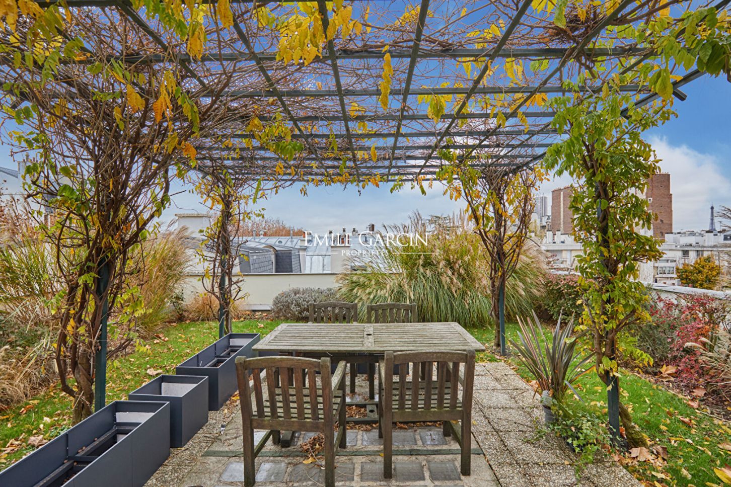 Le dernier étage dessert un toit-terrasse végétalisé d'environ 78 m², offrant une vue dégagée sur la Tour Eiffel.