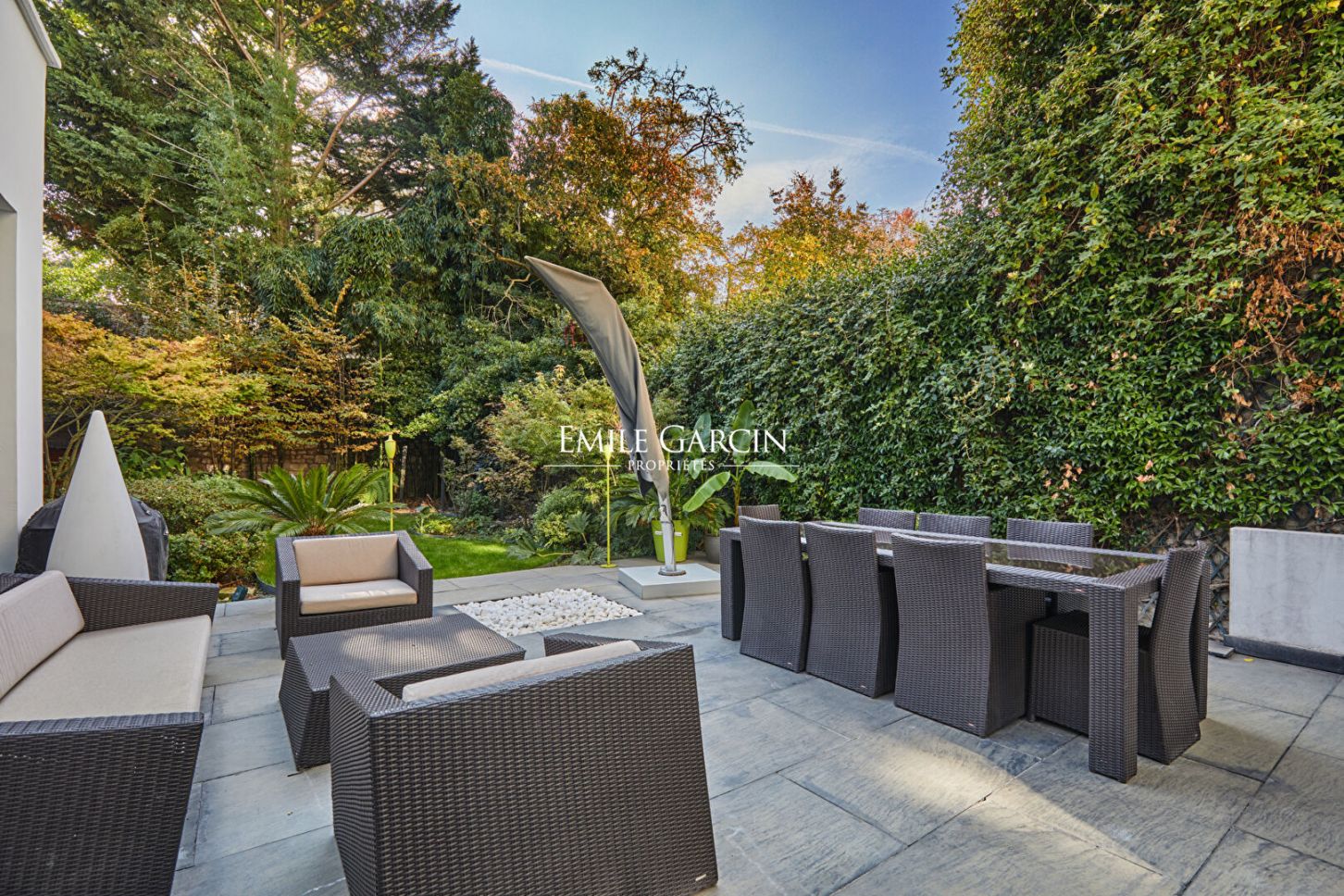 D'une superficie d'environ 530 m² au sol, répartis sur quatre niveaux plus sous-sol et garage, tous desservis par un ascenseur, il offre un cadre de vie confortable et familial. Une terrasse de 42 m² prolongée par un jardin d'environ 135 m², ainsi qu'une deuxième terrasse au premier étage, complètent les espaces extérieurs.