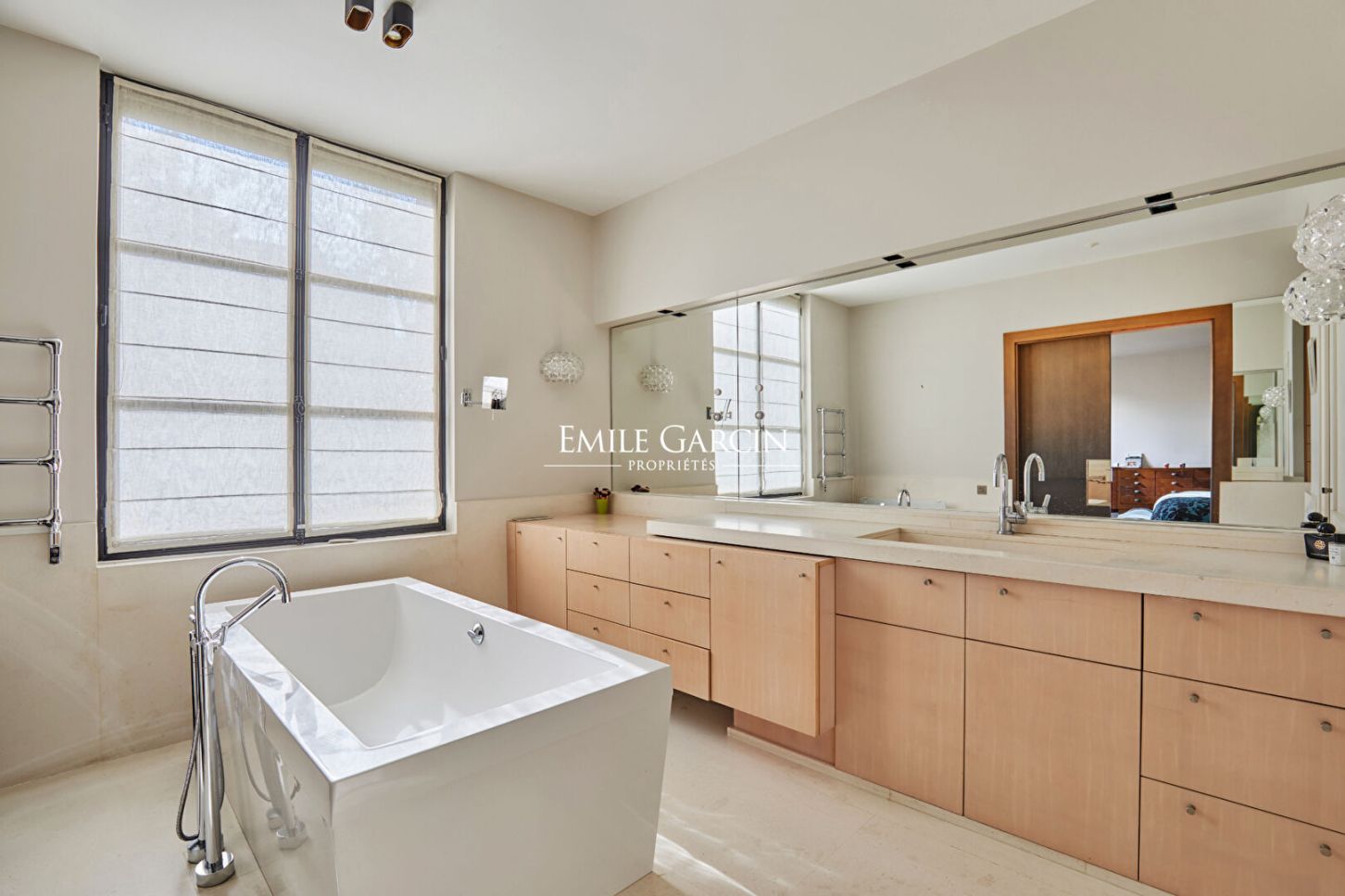 Disposition : Rez-de-chaussée surélevé : entrée avec vestiaire et toilettes, double salon en L ouvrant sur la terrasse et le jardin, salle à manger et grande cuisine familiale. Une pièce indépendante avec accès direct depuis la rue peut servir de bureau. Premier étage : suite parentale occupant tout le niveau, comprenant un bureau, une grande chambre ouvrant sur une terrasse de plain-pied (au-dessus du salon), une salle de bains avec dressing et toilettes, ainsi qu'une salle d'eau avec dressing et toilettes. Deuxième étage : une chambre/bureau, une chambre d'amis avec salle d'eau et toilettes, et un appartement indépendant composé d'un salon, d'une cuisine ouverte, d'un dressing, d'une chambre et d'une salle de bains avec douche et toilettes. Troisième étage : lingerie, et un second appartement indépendant comprenant un salon/salle à manger avec cuisine ouverte, une chambre d'enfants avec salle de bains et toilettes, ainsi qu'une chambre parentale avec salle d'eau et toilettes. Sous-sol : salle de cinéma, lingerie avec accès au jardin, grande cave à vins, rangements, toilettes, local technique et pièce pour le ballon d'eau chaude. Garage pour une voiture de taille moyenne entre le sous-sol et le rez-de-chaussée.