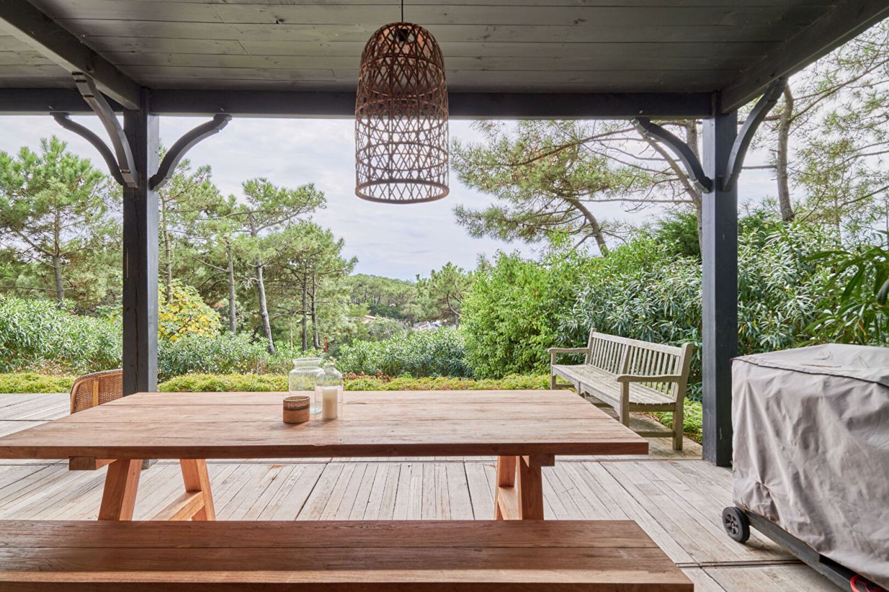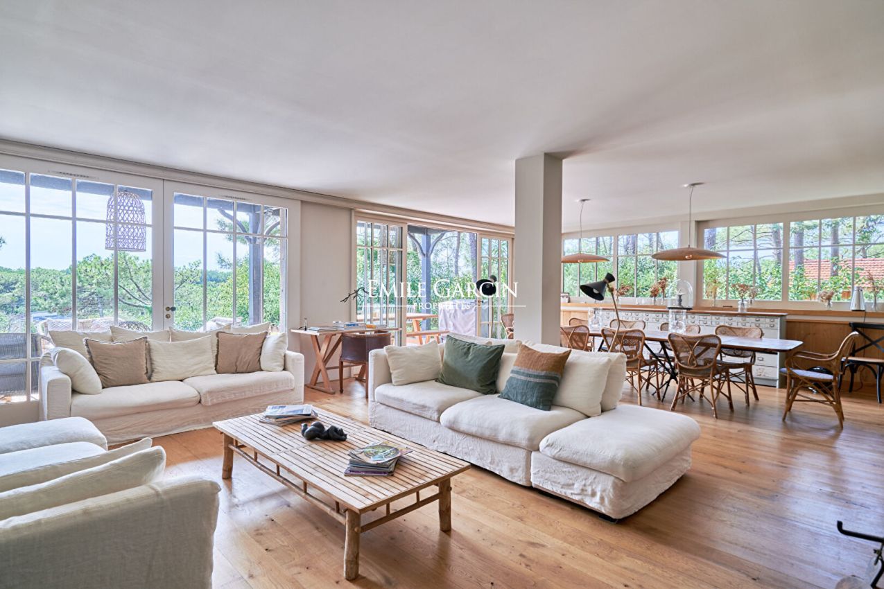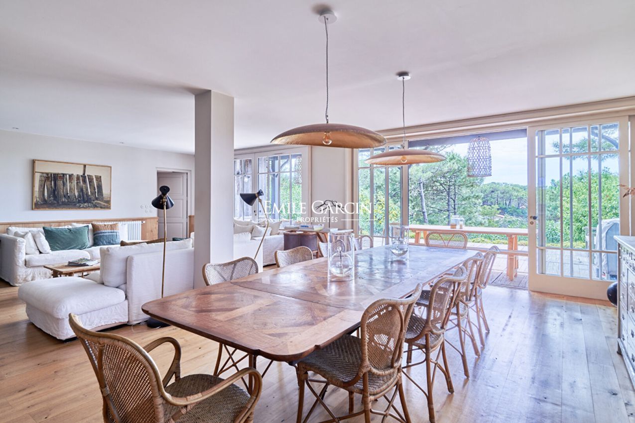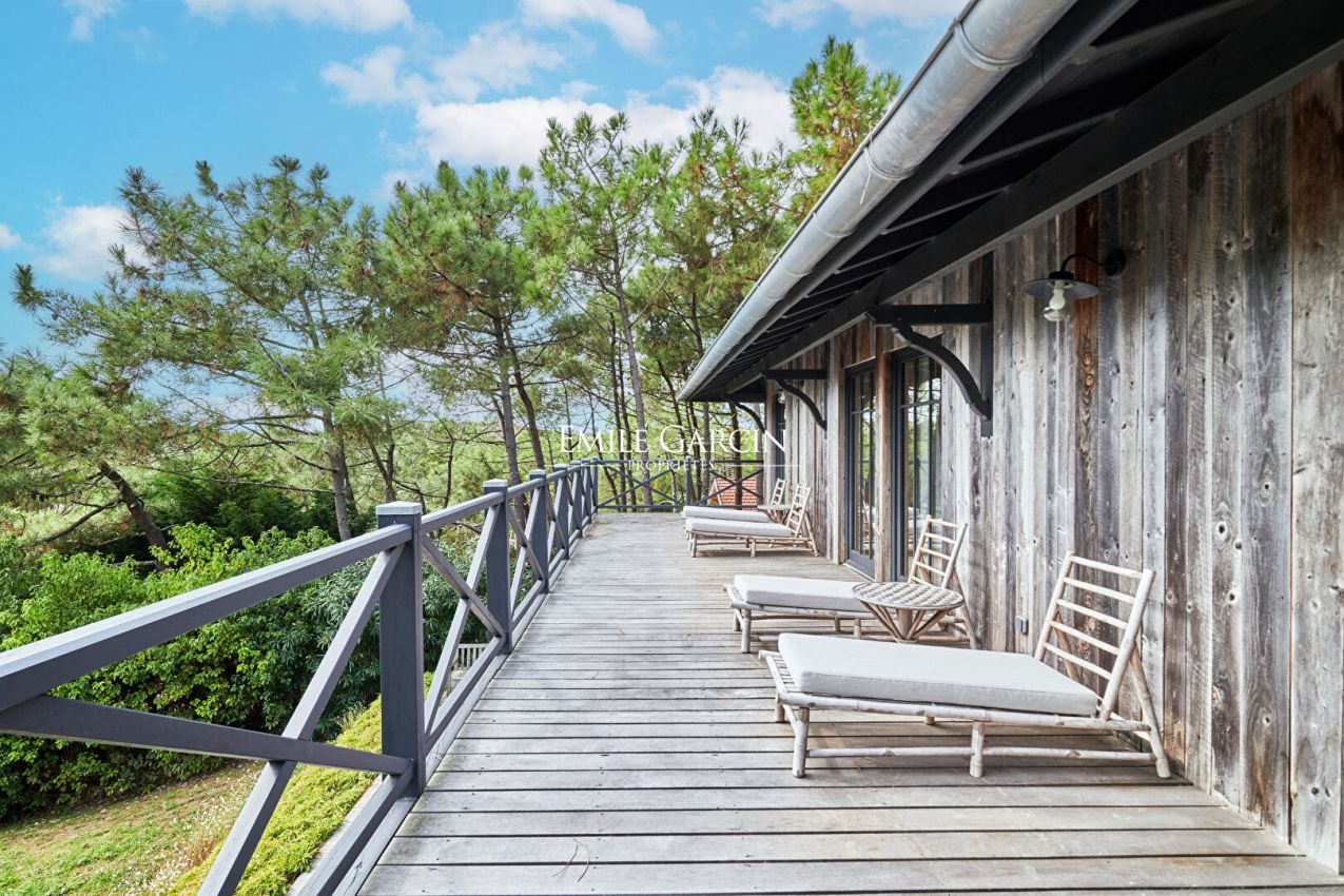 A vendre. Au coeur du Cap Ferret, propriété familiale à l'architecture ferret-capienne nichée dans un écrin de verdure. Entrée, vaste séjour de 100 m² ouvert sur une large terrasse bois avec vue panoramique sur la pinède et les dunes des plages océanes, cuisine équipée La Cornue et ameublement sur mesure. Côté nuit, 6 chambres et leur salles de bains ouvertes sur la terrasse supérieure. En sus, une salle de jeux et une buanderie. Piscine à l'abri des regards au coeur du jardin paysager. Grand garage pouvant accueillir jusqu'à 3 véhicules. Proche des commerces et des plages. Cette propriété d'exception est idéalement située pour vivre à l'heure Ferret-capienne.
