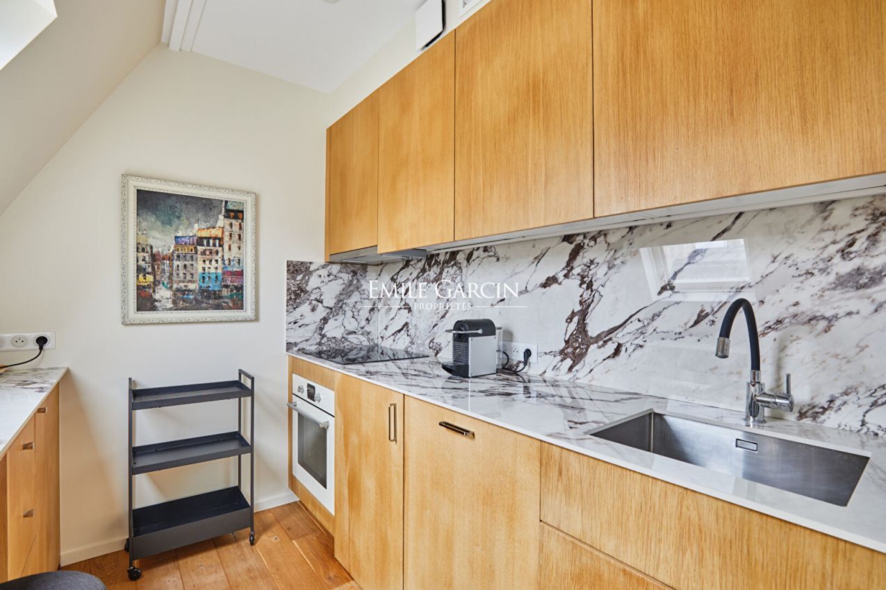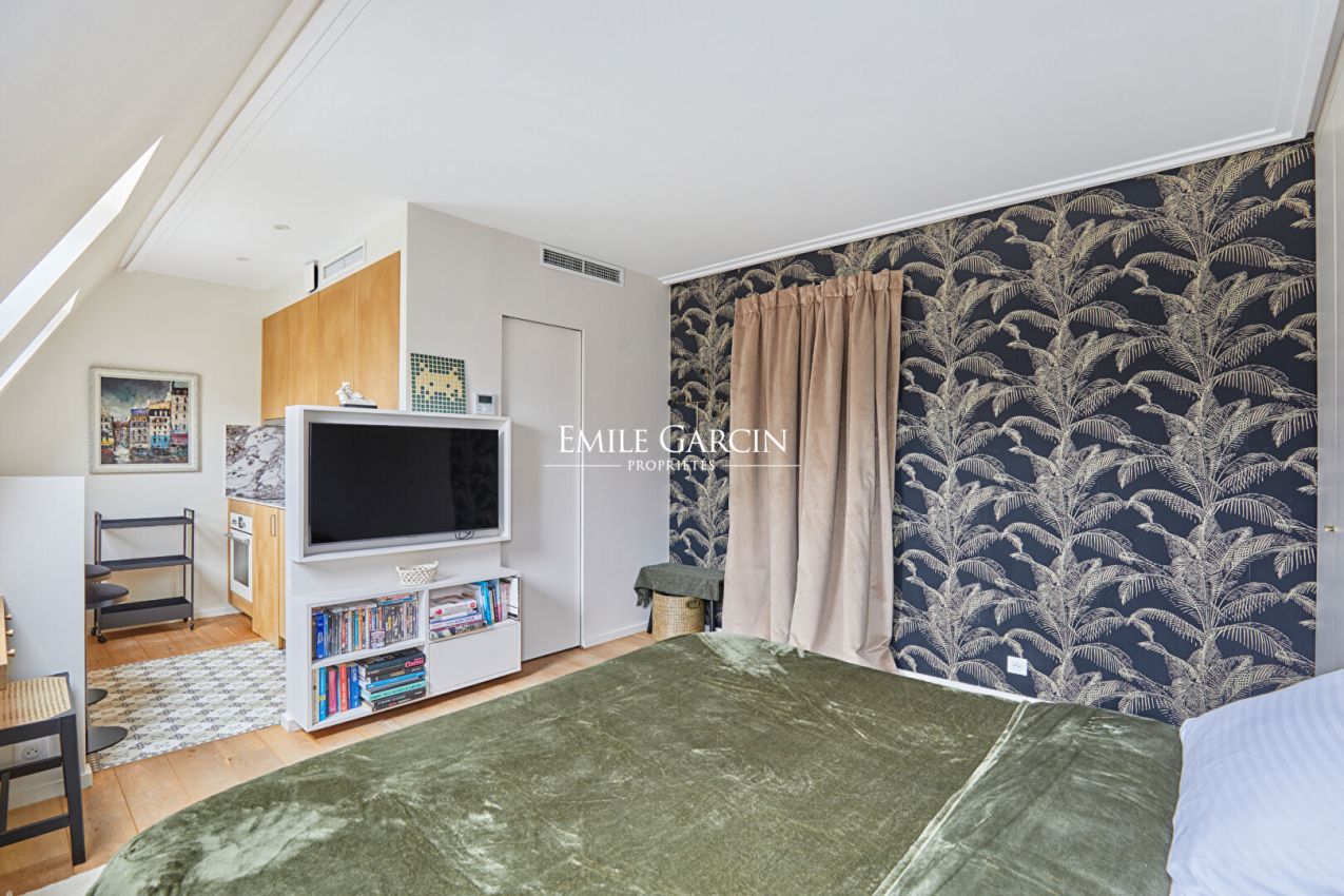 SAINT-PAUL - Au dernier étage avec ascenseur d'un immeuble haussmannien parfaitement entretenu, studio de 27 m2 ( 21,45 m2 carrez) rénové avec des matériaux haut de gamme comprenant ; pièce de vie, cuisine américaine équipée, salle d'eau avec WC. Adresse iconique du Marais, calme et lumineux. Copropriété de 16 lots (Pas de procédure en cours).