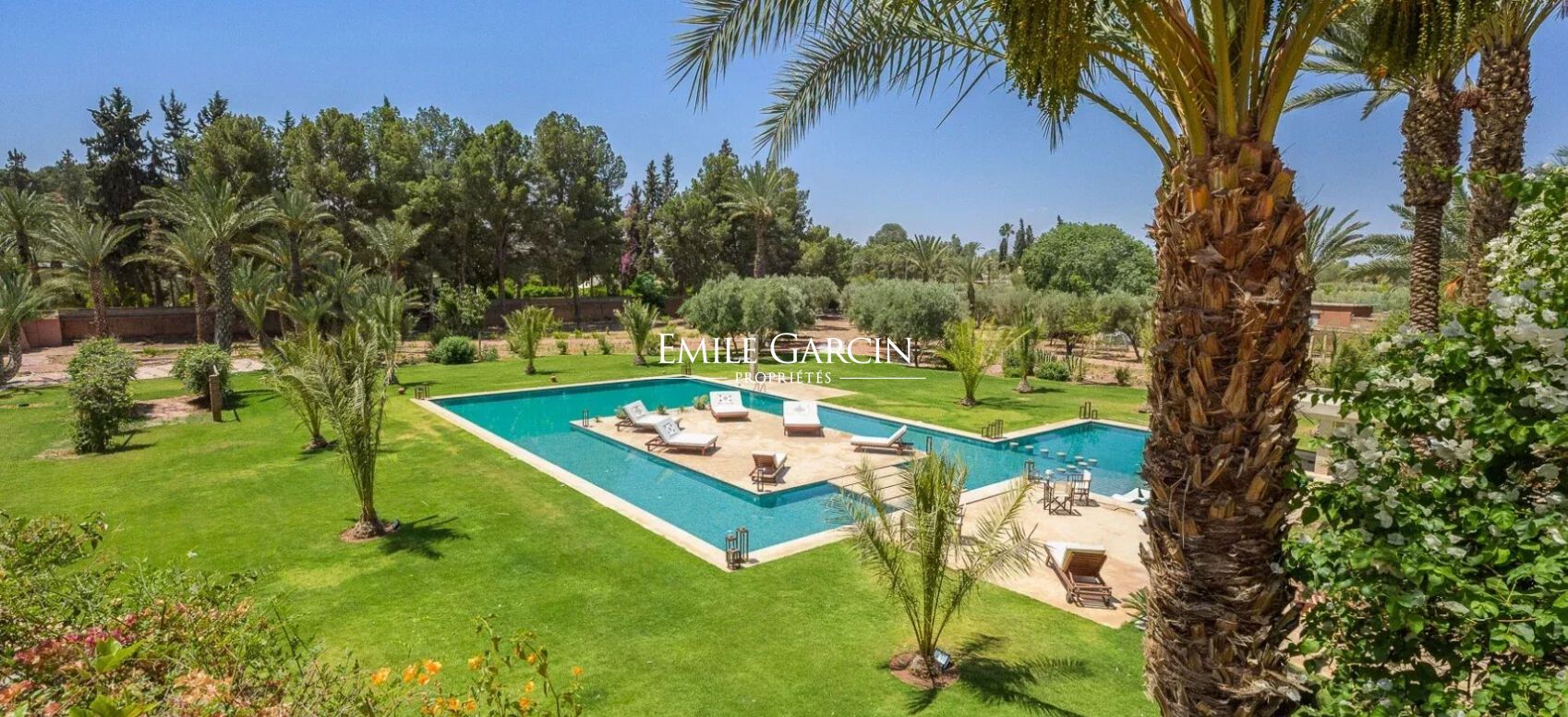 Au coeur de la Palmeraie de Marrakech, superbe propriété signée par l'architecte de renom Charles Boccara, de 1200 m² édifiée sur parc luxuriant de 1,5 hectare.