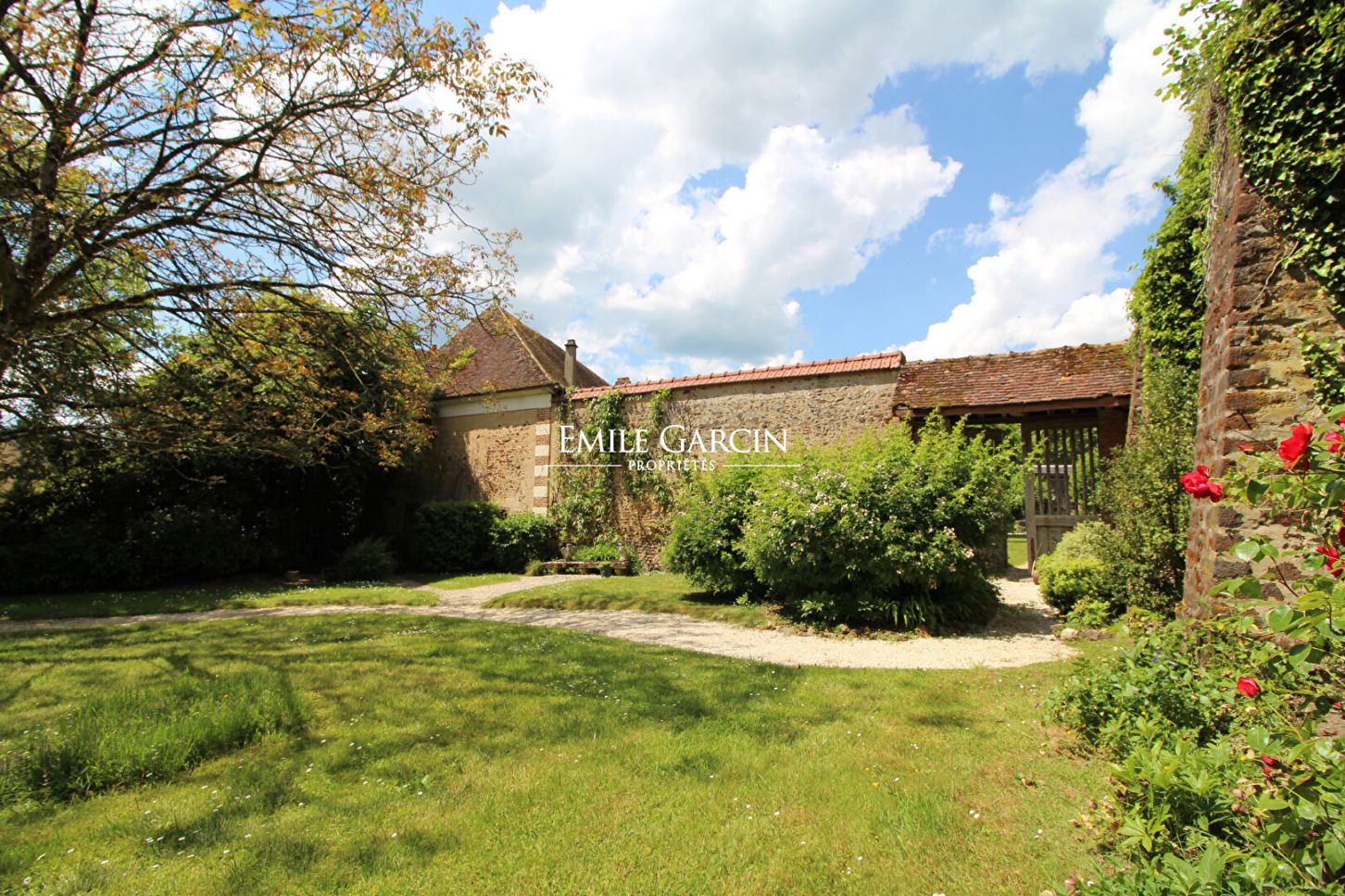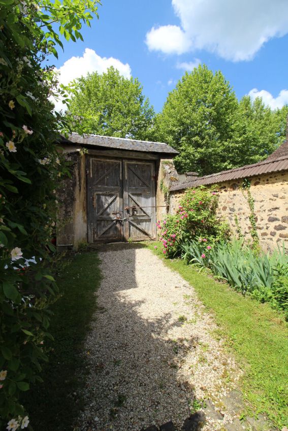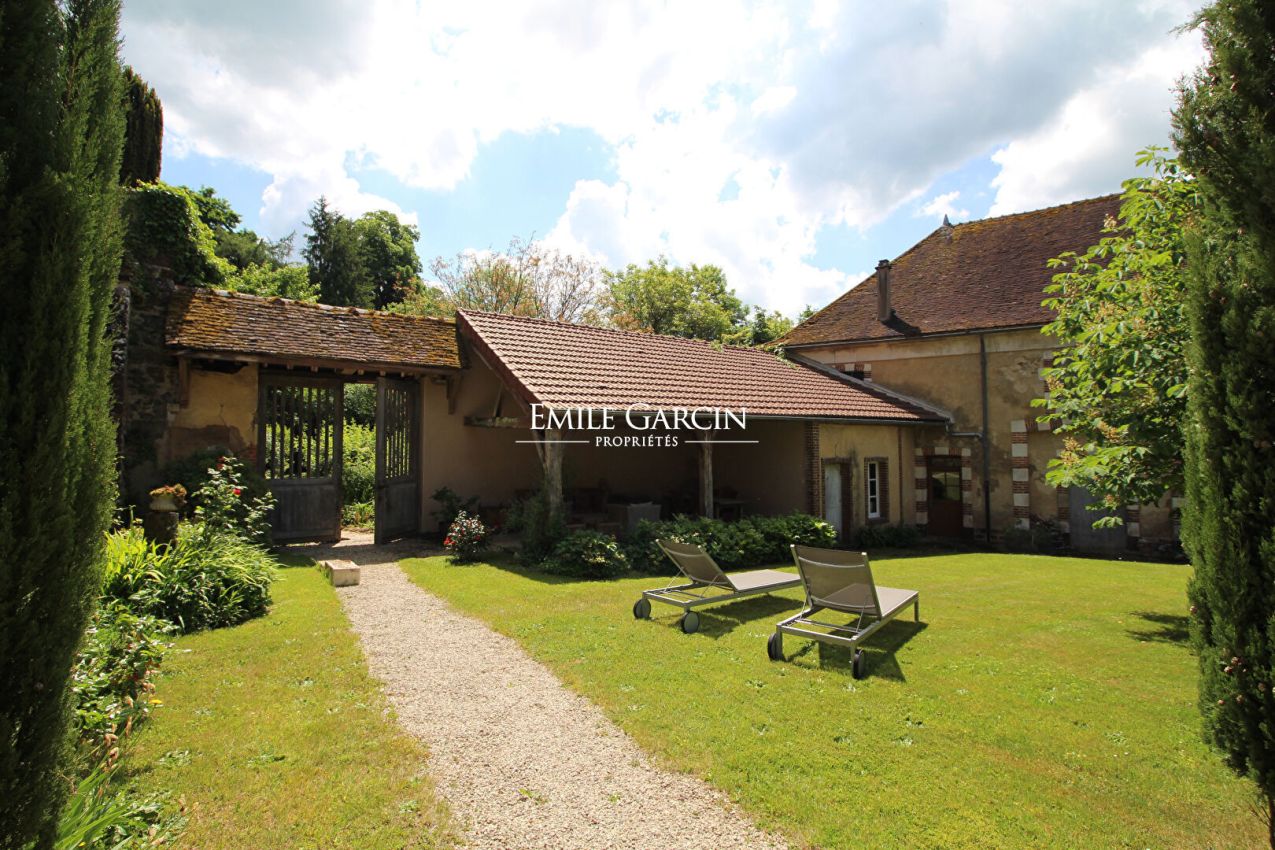 Un large portail s'ouvre sur une cour d'honneur, arborée et paysager avec une grange, d'anciennes écuries, un auvent, un salon d'été et une petite maison d'amis restant avec encore de belles possibilités, chambres supplémentaires ou espaces de réception.