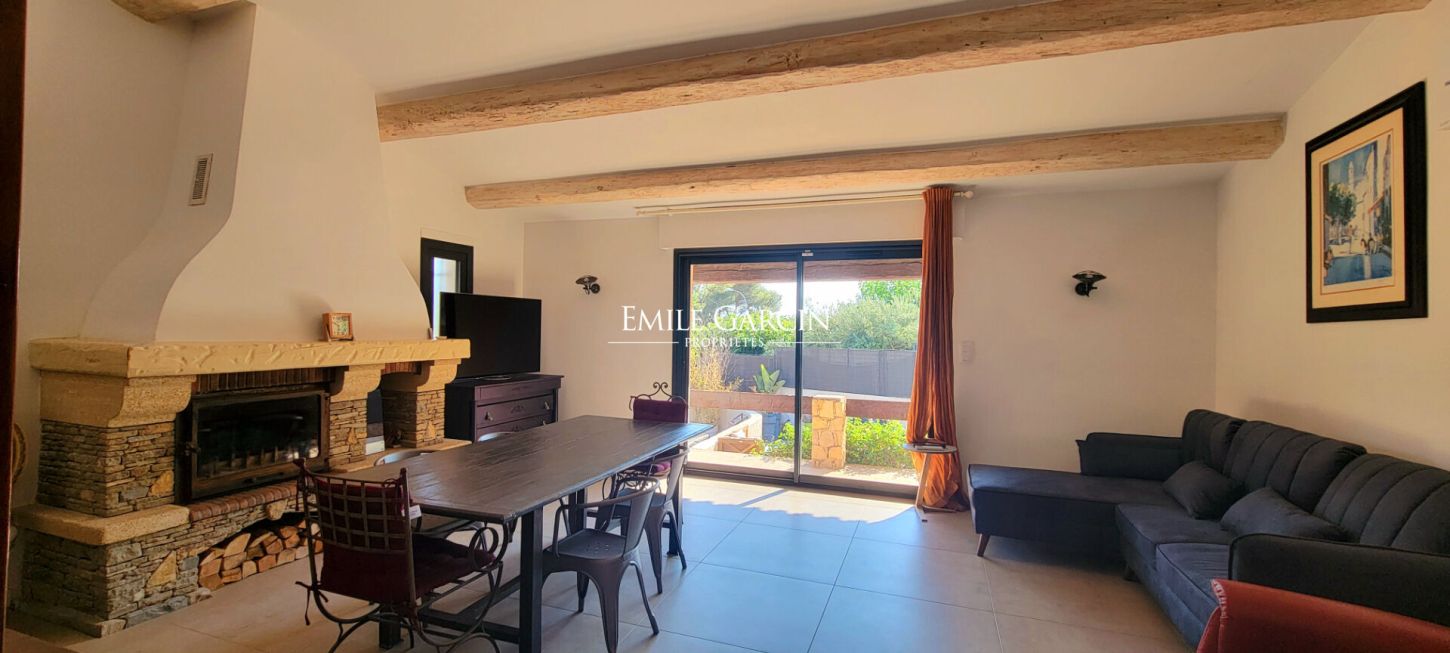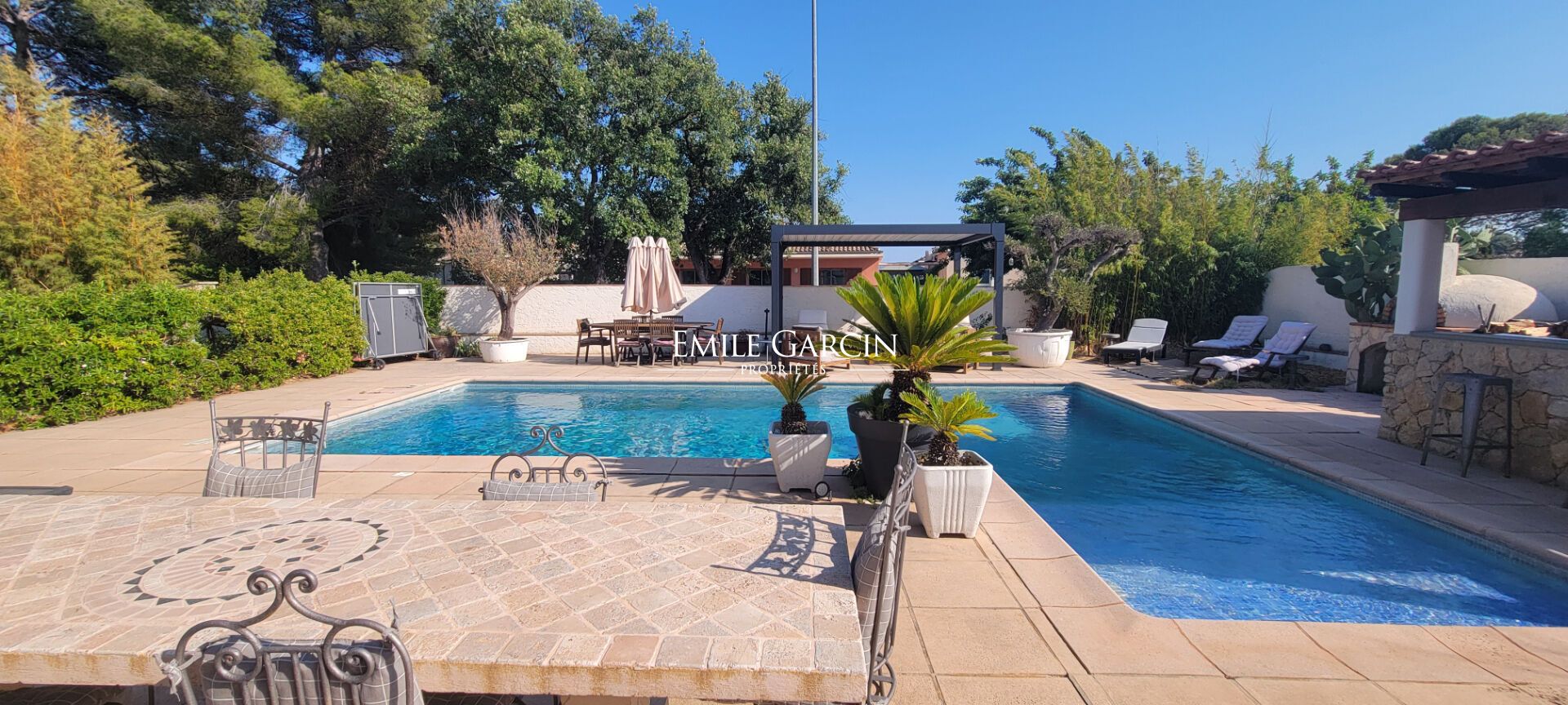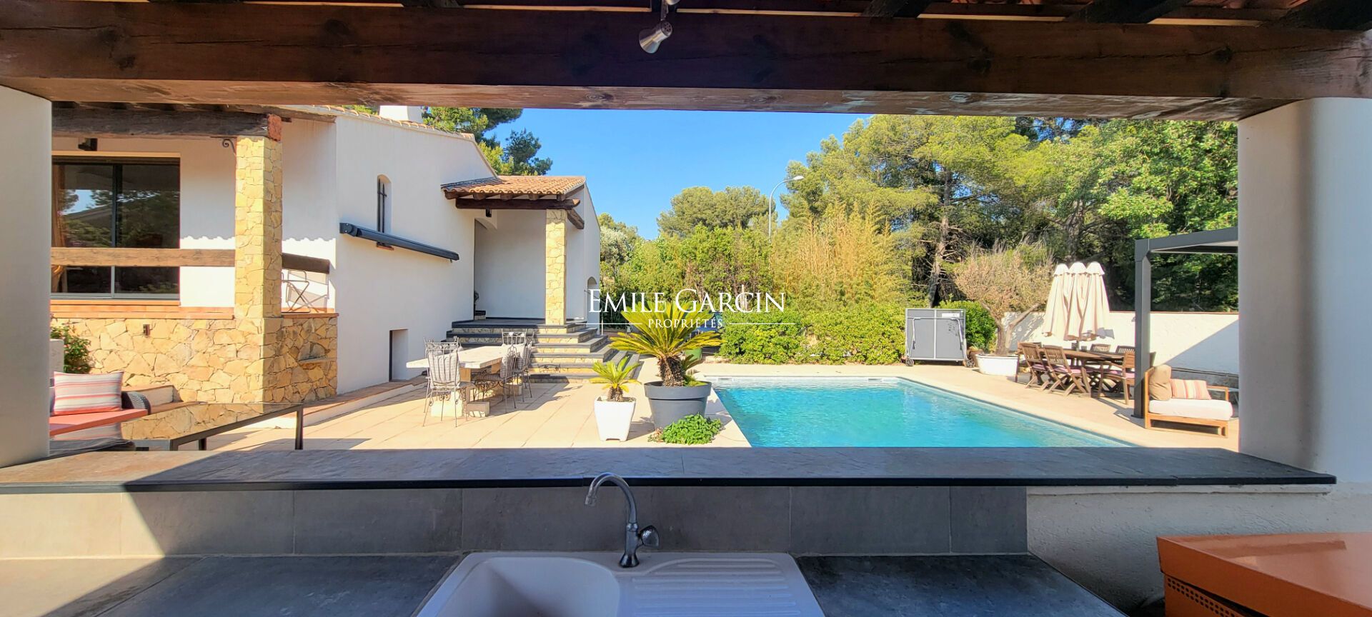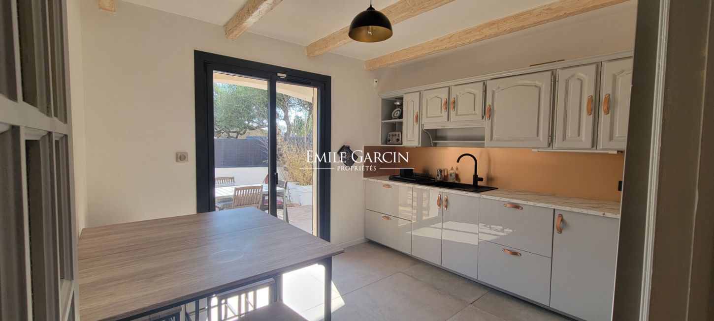 A quelques minutes en voiture du port de Sanary-sur-Mer, cette villa de 150 m2 rénovée et modernisée avec des matériaux de qualité est implantée sur un terrain de 705 m2.