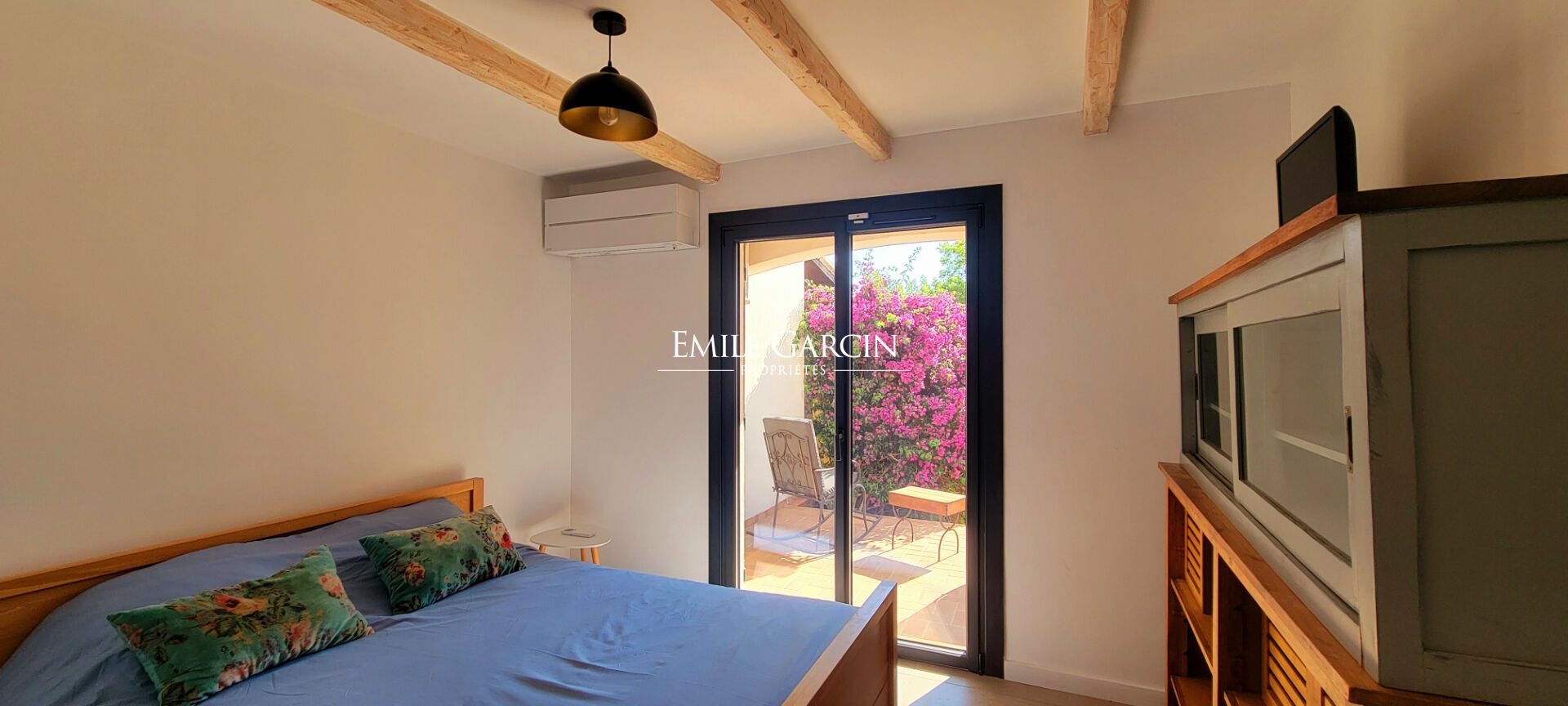 Le rez-de-jardin est composé d'une grande pièce de vie avec cheminée, d'une cuisine équipée ouvrant sur la terrasse, de deux chambres, d'une grande salle d'eau et un espace buanderie. L'étage est composé d'une suite parentale, d'une chambre et d'un espace bureau.