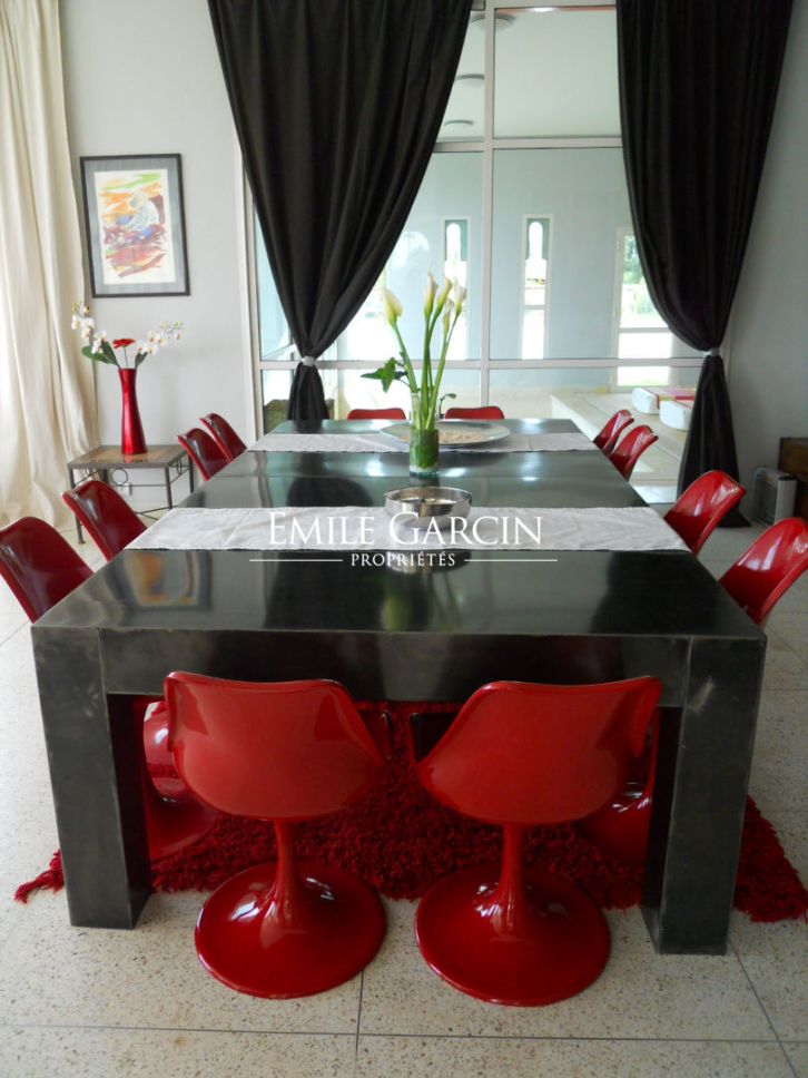 Magnifique propriété de 800m² sur un parc arboré d'un hectare dans la Palmeraie de Marrakech à Bab Atlas. Jolie vue sur l'Atlas. Le design de la maison est minimaliste, le patio intérieur et les baies vitrées créent une transition entre les volumes baignés de lumière et l'extérieur. Vaste réception, séjour avec cheminée, salle à manger, bibliothèque.