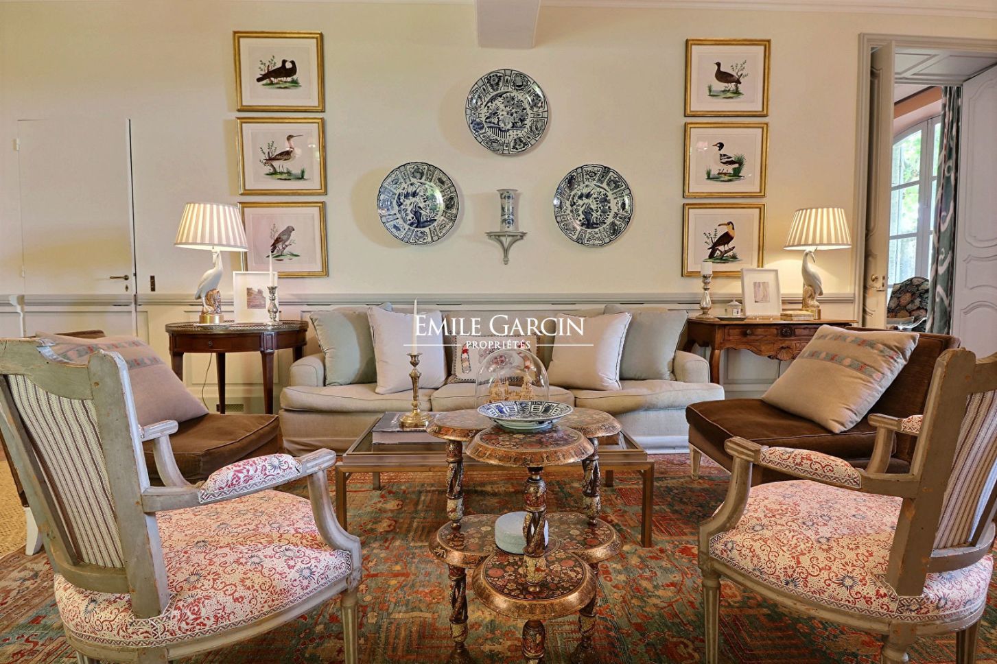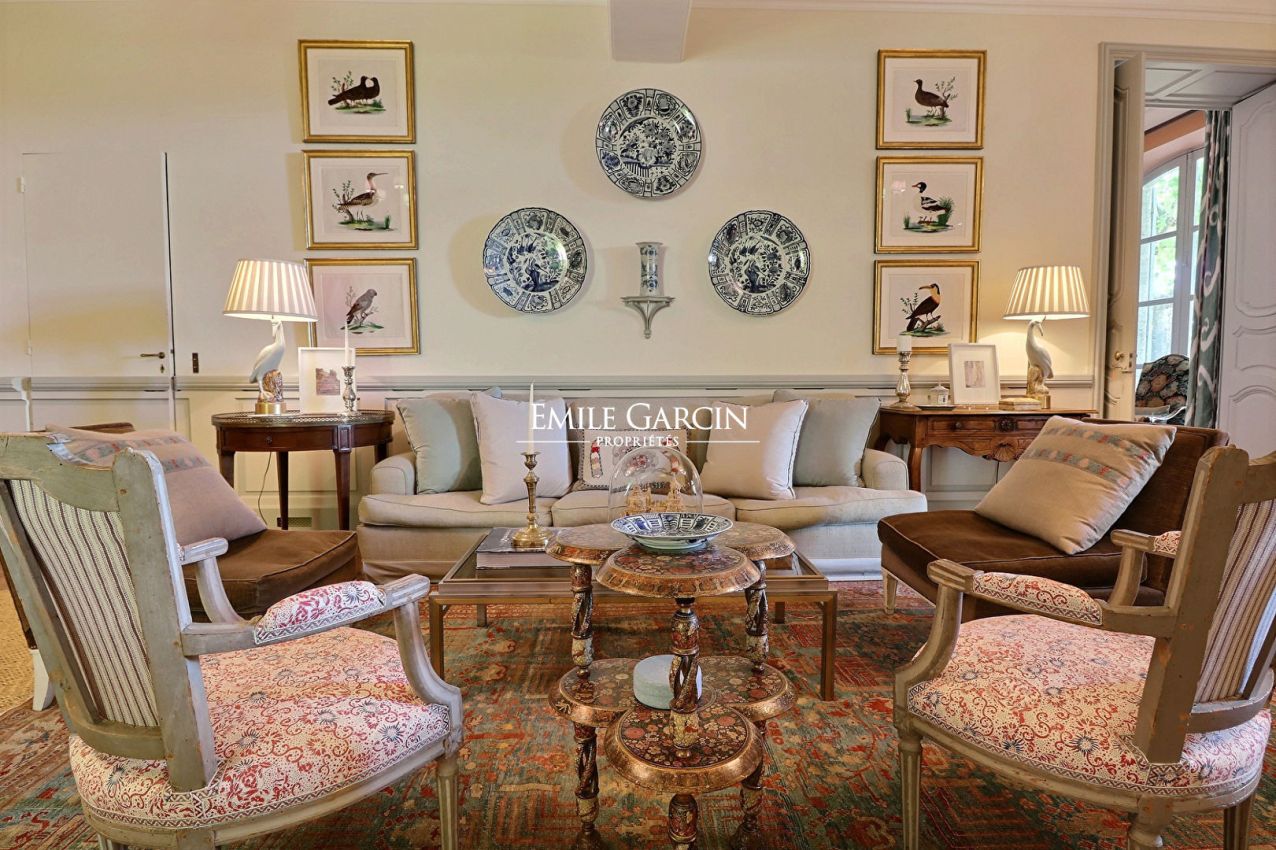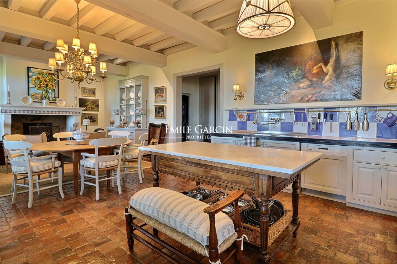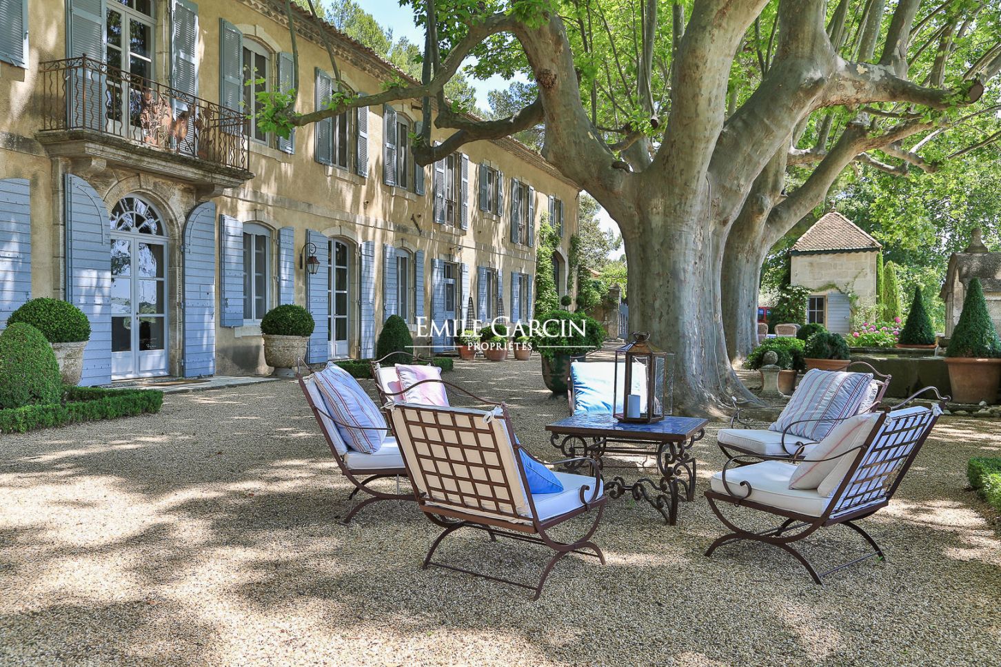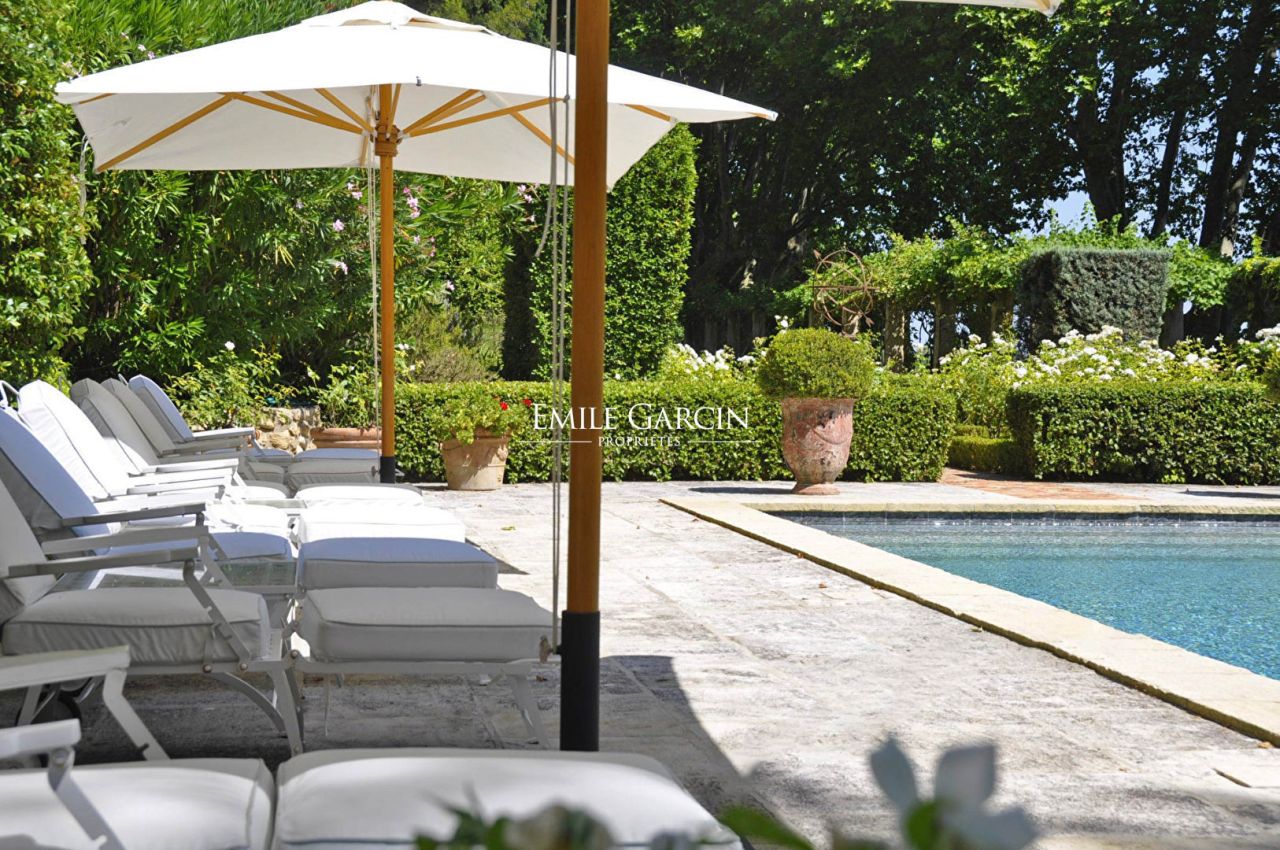 Au sud des Alpilles, domaine de 56 hectares et sa splendide bastide à la décoration soignée, offrant 7 chambres - Climatisation - Grande piscine chauffée - Tennis La bastide se compose ainsi : En rez-de-jardin : Vaste entrée desservant les pièces à vivre. Salle à manger avec cheminée en pierre et alcôve servant de desserte.