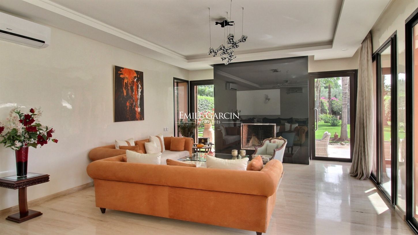 Dans un domaine privé, route de l'Ourika, belle propriété de 340 m² sur un parc paysagé de 4500m². Double salon avec cheminée, salle à manger avec vue sur le jardin et la piscine, salon de jardin.