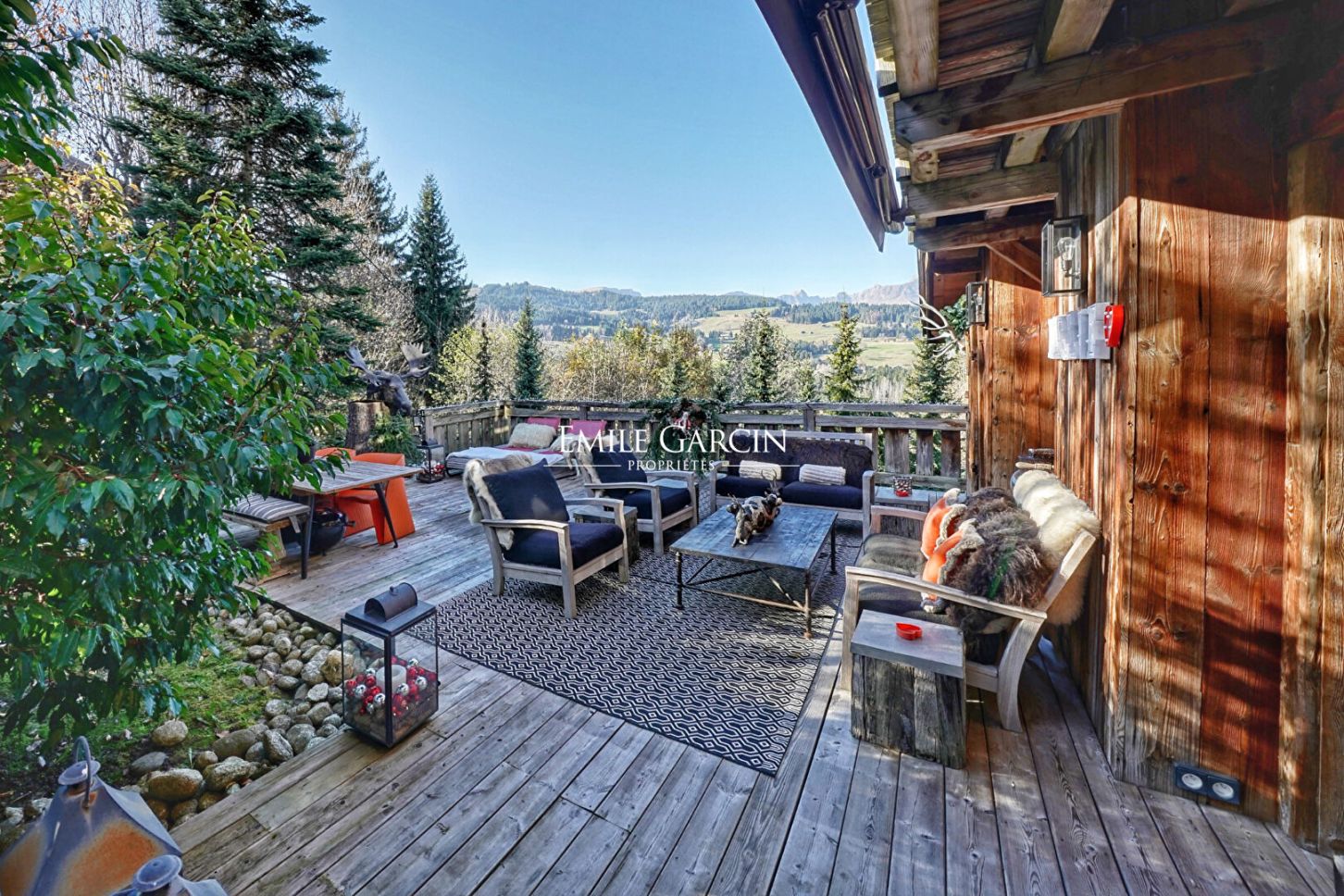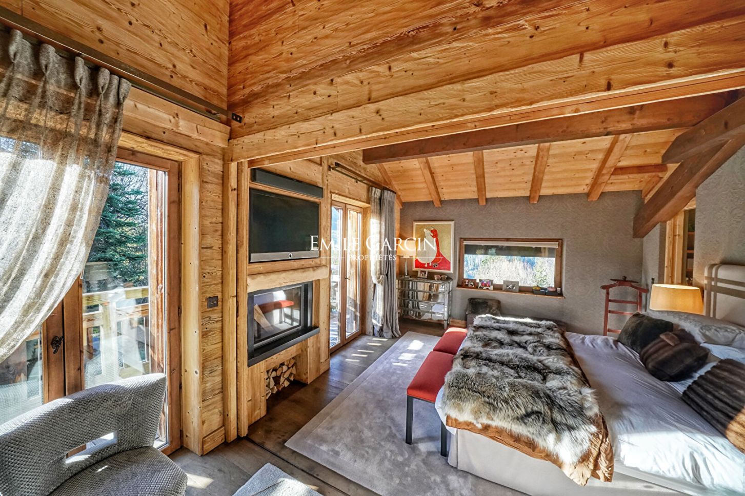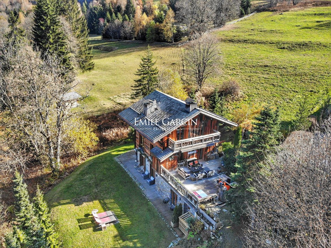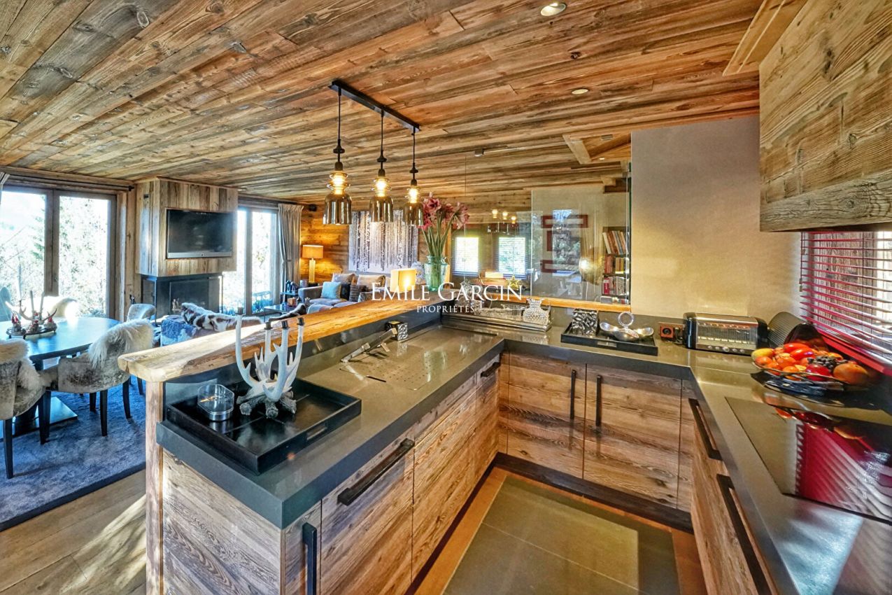 Chalet à vendre Mont-d 'Arbois à Megève, entièrement rénové en 2011/2012 construit sur 3 niveaux, très belle vue sur les montagnes environnantes. Terrain 1.390 m². Comprenant: séjour avec cheminée et coin-cuisine entièrement équipé donnant sur une grande terrasse exposée plein Sud. Chambre master en suite sous-toiture avec cheminée, coin salon/bureau, 3 chambres en suite accès terrasse/jardin, cave à vin. Possibilité d'agrandissement de 60 à 70m². Place de parking extérieure devant l'entrée du chalet Dans copropriété voisine: 3 places de parking couvert et accès tennis / piscine