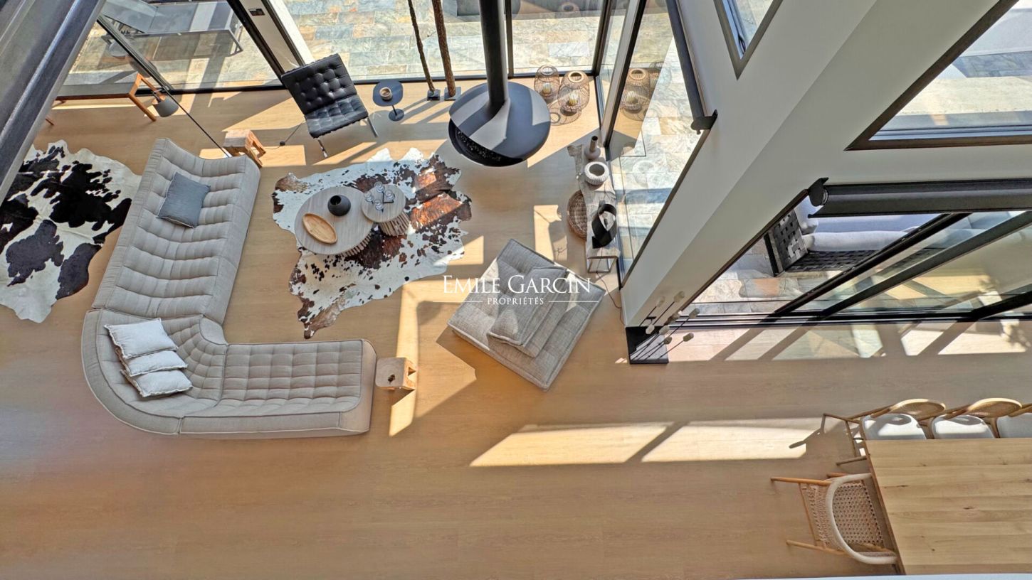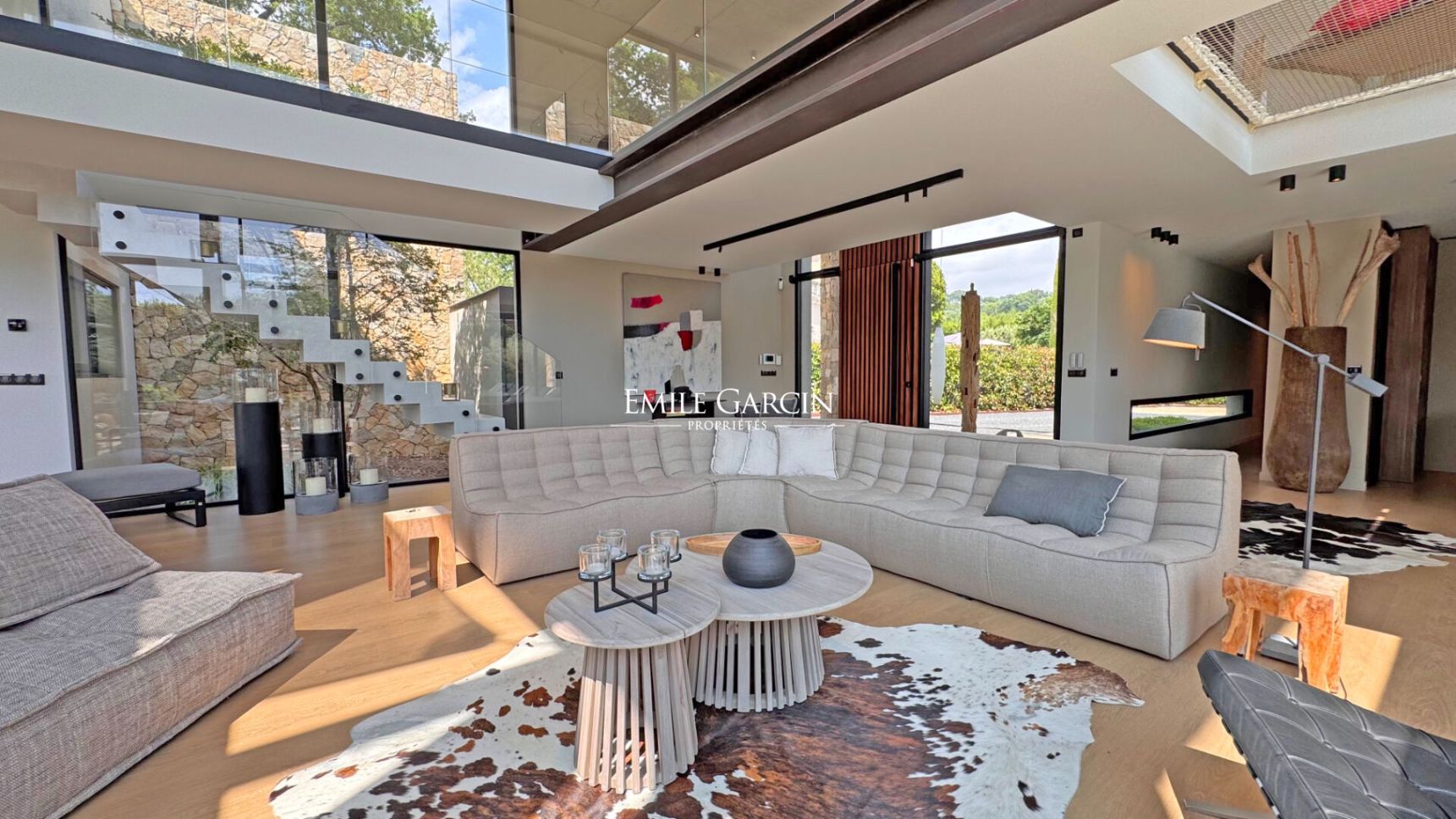D'une surface généreuse, elle dispose de 5 chambres doubles, toutes avec salles de bain en suite, climatisation réversible, et des finitions haut de gamme. Le vaste salon s'articule autour d'un espace home cinéma, d'un coin détente et d'une cuisine américaine ouverte avec grande table à manger.