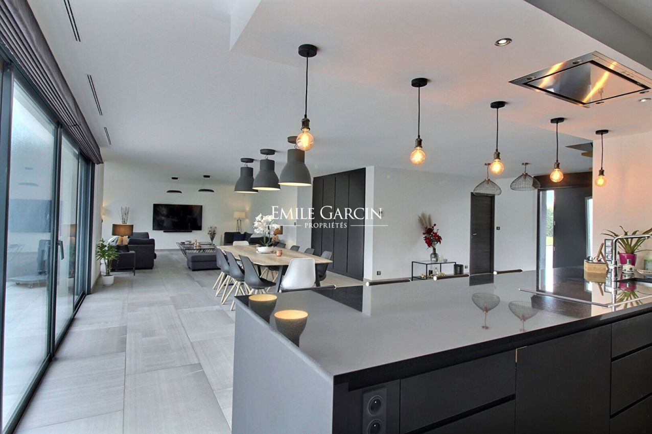 Cette superbe maison contemporaine de 275 m² implantée sur un terrain d'environs 2500m² dans un domaine privé, séduit par ses lignes épurées, ses volumes généreux et son ambiance chaleureuse, pensée pour offrir un cadre de vie résolument privilégié. Au rez-de-chaussée, une entrée accueillante dotée d'un coin bureau s'ouvre sur une vaste pièce de vie baignée de lumière, réunissant une cuisine entièrement aménagée et équipée, une salle à manger conviviale et un salon élégant, prolongés par une terrasse invitant à la détente. Une suite de plain-pied avec douche et toilettes privatives fermées offre un espace intime et confortable. Pour les moments de bien-être, un espace piscine chauffé et fermé complète ce niveau, agrémenté d'une salle d'eau et de toilettes indépendantes. Un double garage, accessible directement depuis l'intérieur, garantit praticité et sécurité. A l'étage, un salon en mezzanine, idéal comme espace détente, dessert une chambre avec salle d'eau privative, ainsi que trois chambres dotées de placards intégrés. Une salle de bains et des toilettes séparées complètent cet étage harmonieusement conçu.