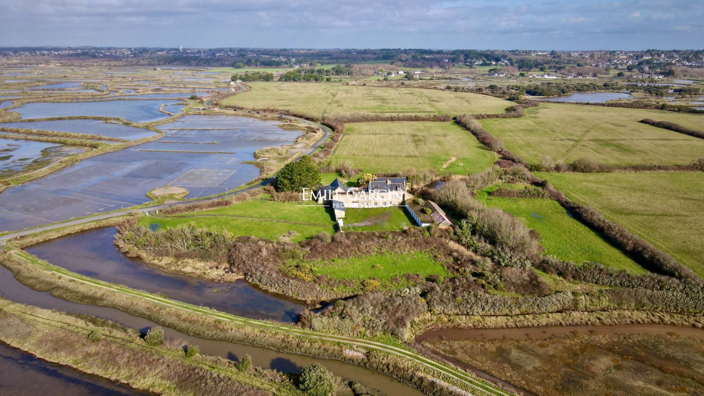 La propriété de 37 hectares est en plein coeur des marais salants inscrit au patrimoine mondial de l' Unesco, inventoriée Natura 2000 . L'intérêt biologique et paysager de la Presqu'île Guérandaise est reconnu dans le monde. La propriété est composé de 35 hectares d'un seul tenant exploités en foin biologique Ecocert et de 2 hectares environ où sont situés les différents bâtiments comprenant : - Une maison principale d' environ 300 m² - Un commun comprenant 3 gîtes. - Une ferme. - Un gîte attenant au logis - Un hangar ouvert de 230 m² au sol. - 10 boxes.
