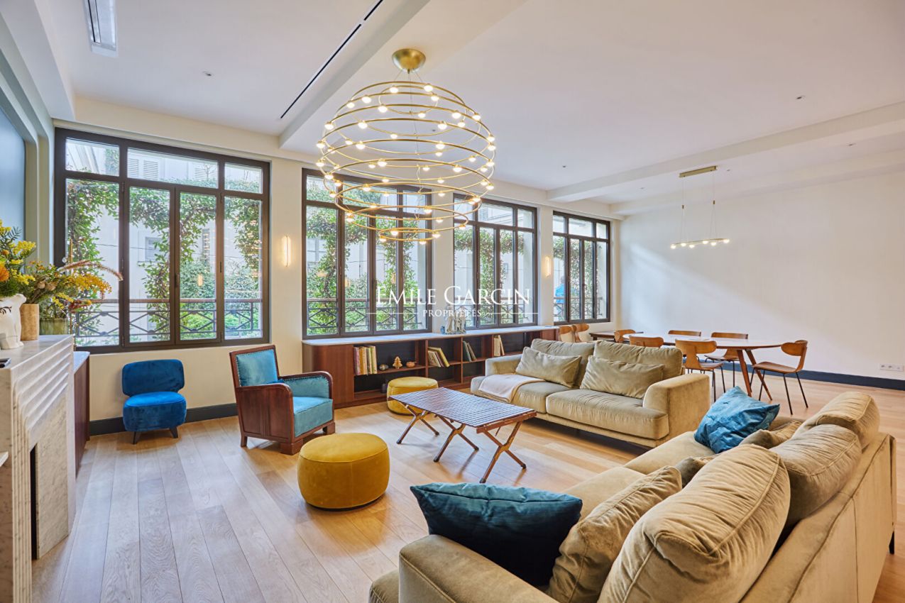 Triplex de 180 m² situé rue de Bellechasse, à proximité du musée d'Orsay. Au rez-de-chaussée, une vaste pièce de vie s'ouvre sur une cuisine américaine aménagée et équipée, ainsi qu'un salon-salle à manger entièrement ouvert. Un WC invités complète ce niveau.