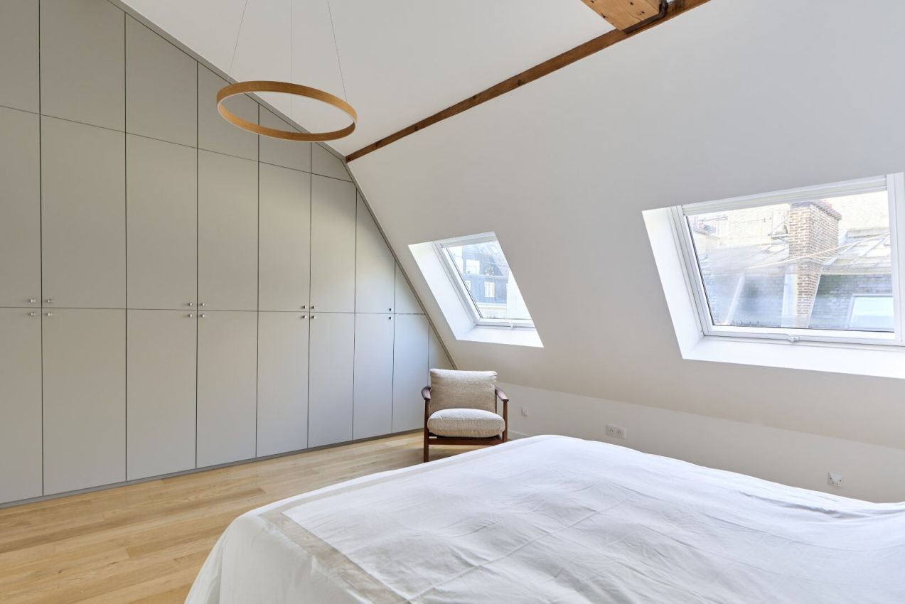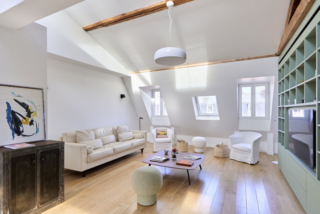 Au 6e et dernier étage d'un bel immeuble ancien, au sein d'une copropriété sécurisée et à l'abri des regards, très joli appartement meublé de 123m² (145m² au sol) totalement refait à neuf. Il se compose d'une entrée avec armoire, un joli séjour avec bibliothèque, une grande cuisine entièrement équipée (appareils éléctromenager haut-de-gamme) et coin de salle à manger, 3 chambres, deux salles d'eau dont une avec WC, une buanderie, des WC séparées. Calme absolu. Copropriété avec de nombreux gardiens.