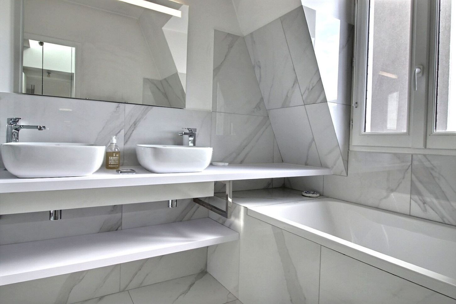 Proche de la Cour Albert 1er et de la Seine, bel appartement de 100 m² (83 m² loi Carrez) au 5ème et dernier étage d'un très bel immeuble de standing en pierre de taille. Il se compose comme suit: entrée avec vestiaire et toilettes, salon/salle à manger avec cuisine ouverte, une première chambre avec salle de bains, douche et toilette. une deuxième chambre avec salle de douche. Prestations et matériaux de qualité.