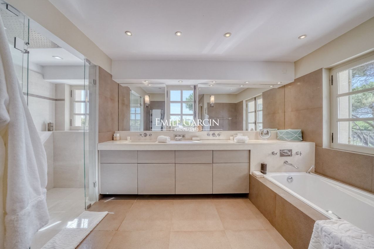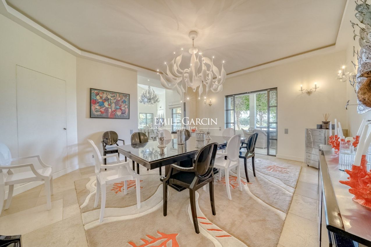Dans le prestigieux domaine privé et sécurisé des Parcs de Saint-Tropez, véritable presqu'île de 200 hectares entourée de criques privées abritant les plus belles propriétés, propriété à la location de 600 m² de style contemporain au coeur d'un jardin paysager de 8 000 m².