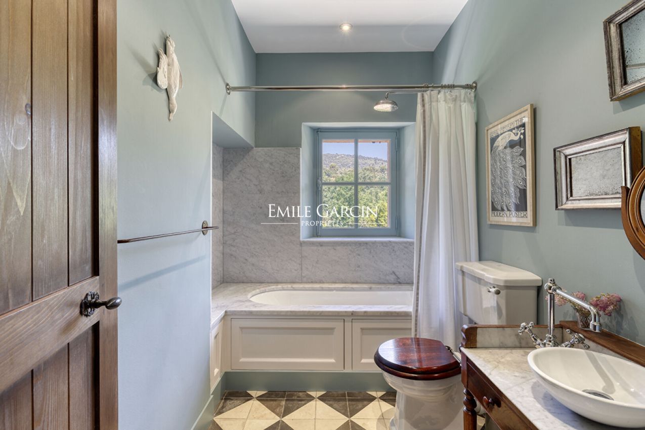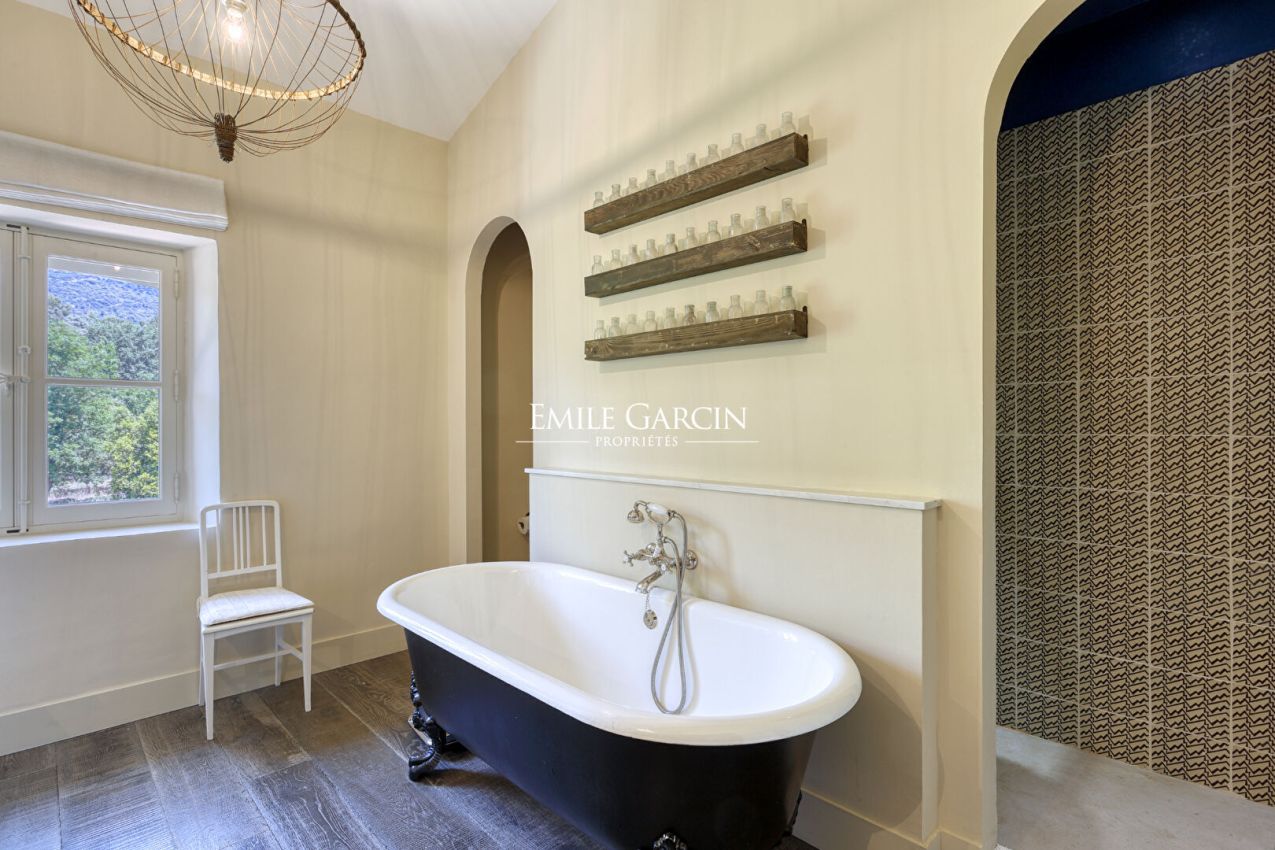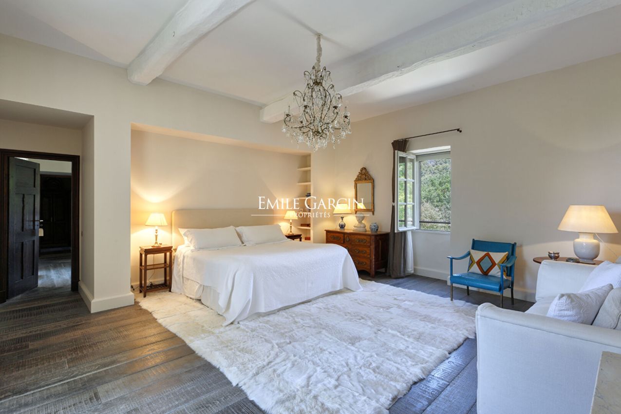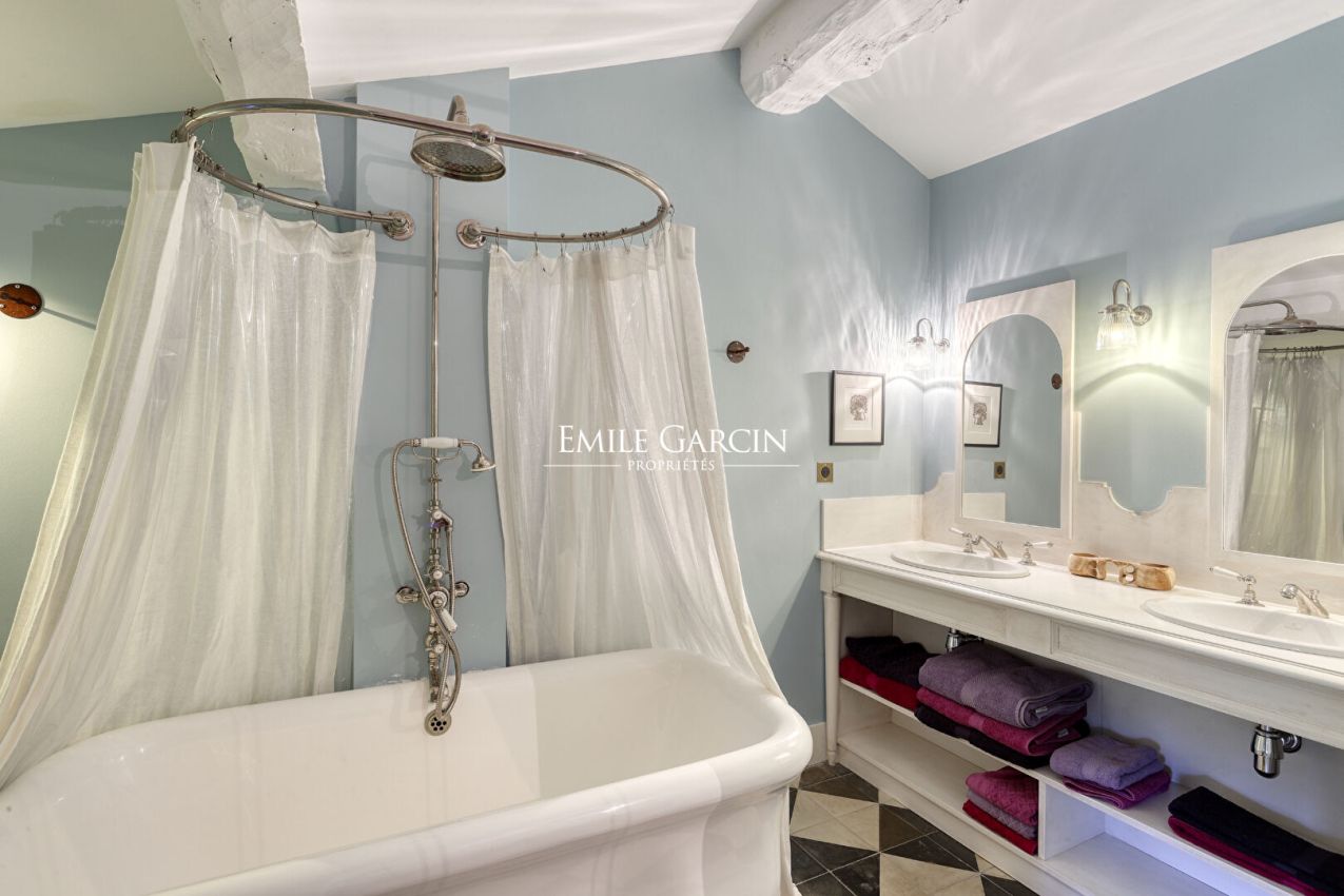 La Bastide de Vaunière située à 30 minutes d'Aix-en-Provence, dans le Sud Luberon, à 1,4 km d'un des plus beaux villages classés de France. Dans un lieu très privé au coeur d'un environnement rare et intact, au plus grand calme, majestueuse demeure provençale des XVII et XVIIIème siècles s'articulant autour d'une cour intérieure. Elle comprend 500 m² habitables sur plus de 11 hectares de terres, parc, oliveraie, potager, fruitiers, truffière, bassins, sources. Beaucoup de charme et de quiétude, l'une des plus belles propriétés de la région. 6 chambres, 6 Salles de bain, 17 personnes maximum - Piscine chauffée 13 x 6 m. Salle de fitness/danse accessible sur demande
