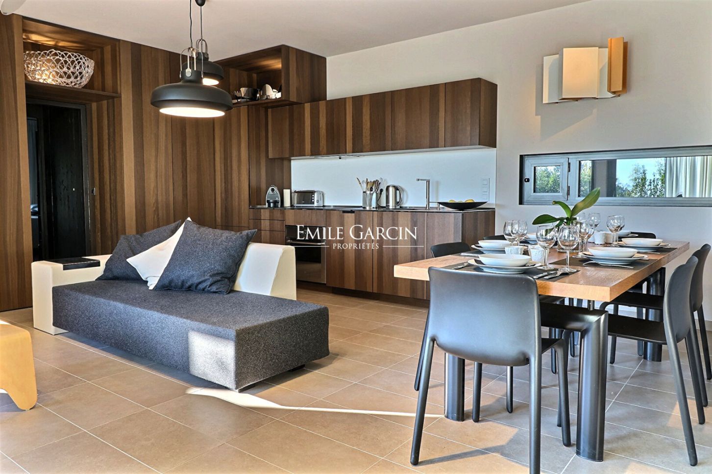 Appartement à l'étage ; 1 chambre, 1 salle de bain, dressing, climatisation, cuisine équipée, coin repas et salon meublé dans un style contemporain. Grande terrasse avec salon d'extérieur et table. Belles vues.