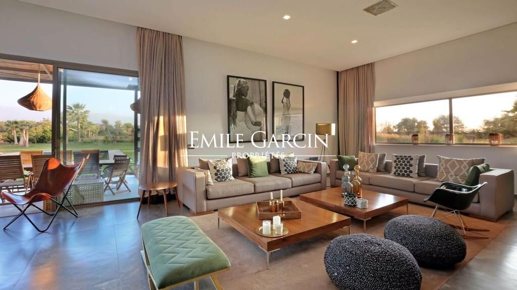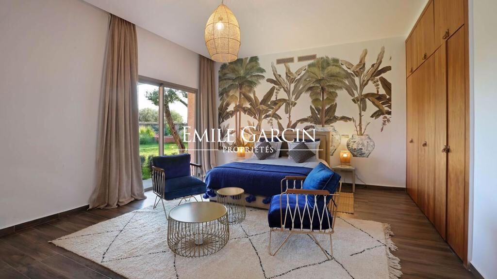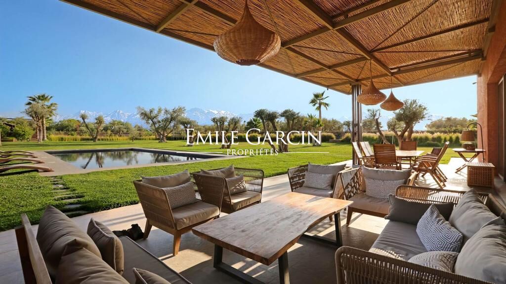 A louer dans la campagne de Marrakech à 25 minutes du centre ville, propriété moderne et écoresponsable, de plain-pied d'une superficie de 500 m² avec vue sur les montagnes de l'Atlas, terrain d'un hectare. La résidence principale de style contemporain et raffinée est composée de 4 suites de 35 m² ainsi qu'un bureau , un vaste séjour avec cheminée, cuisine entièrement équipée. Piscine de 15m x 7m, terrasse, pool house ainsi qu'un grand potager et un terrain de pétanque . Dans le parc vous trouverez un Lodge berbère chic de 70m2 composé de deux chambres et d'un salon. Située à dix minutes des golfs. A partir de 750 euros/ nuit