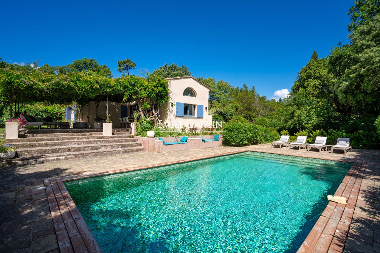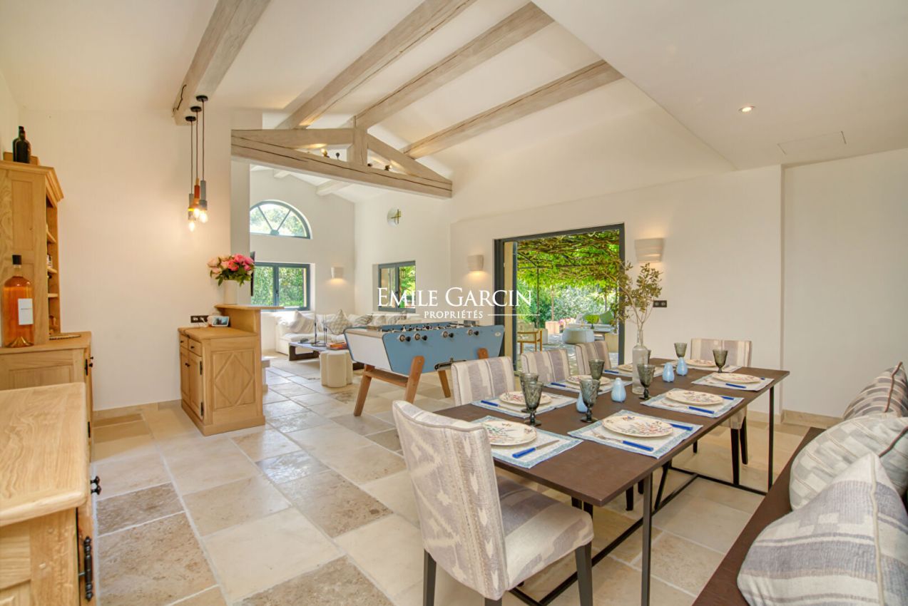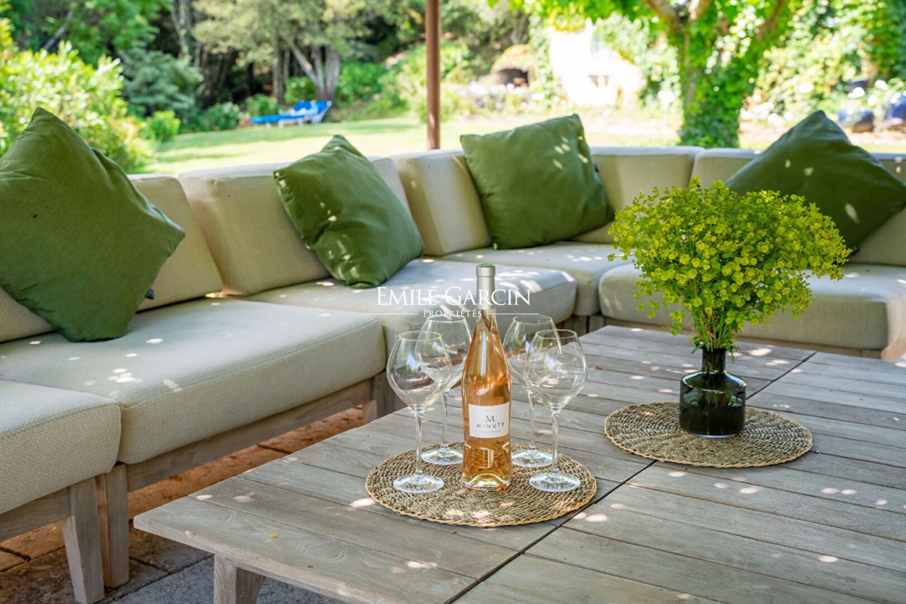 Nichée dans un écrin de verdure, à proximité de Ramatuelle et Saint-Tropez, cette élégante maison de 260 m² offre un cadre paisible et convivial. Elle se compose de 3 chambres dans la maison principale, d'un dortoir ainsi que d'une maison d'amis indépendante avec 1 chambre. Le jardin paysager accueille un parcours pour enfants et une piscine chauffée et sécurisée (10x6 m).