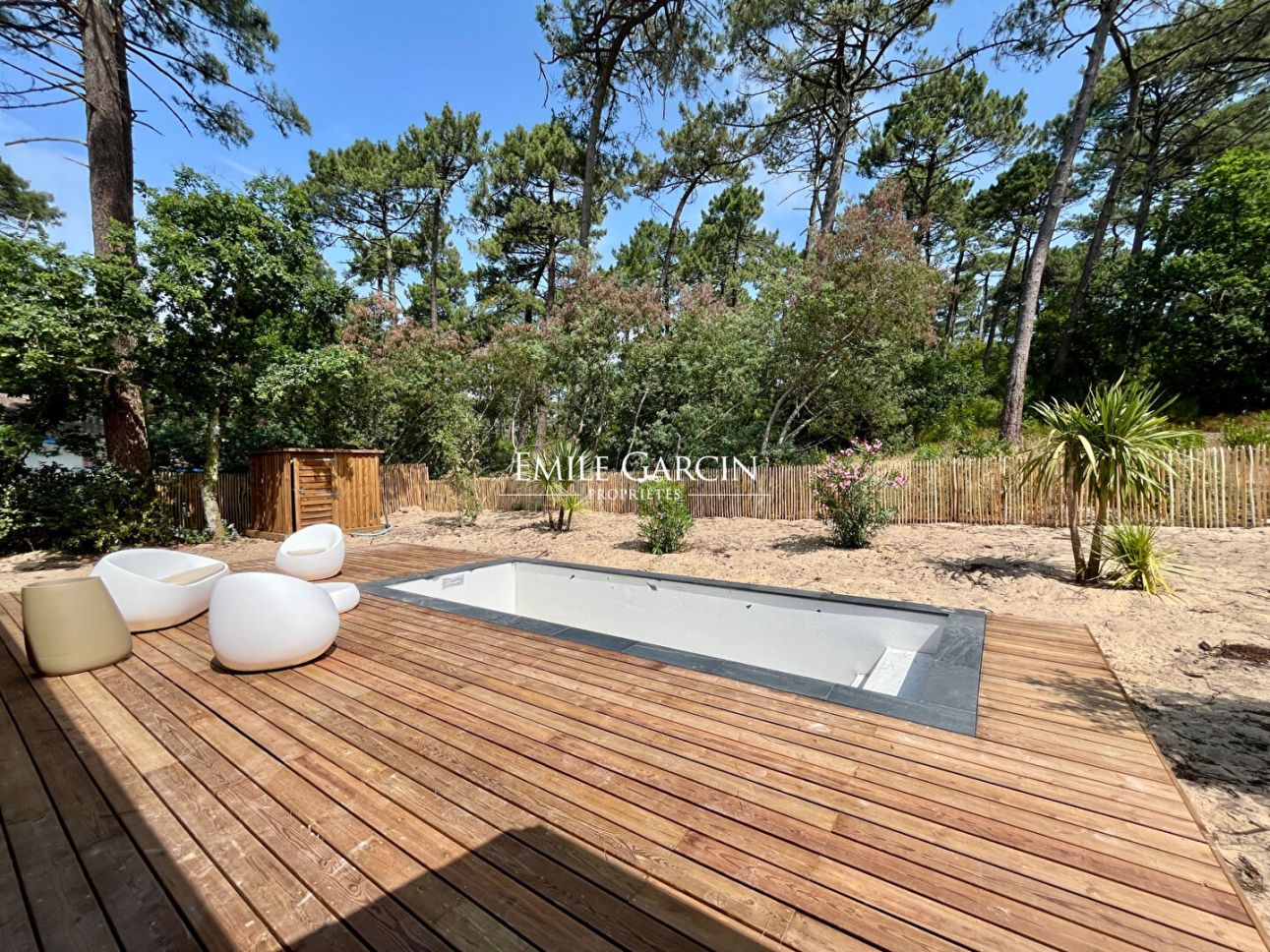Un Jardin paysager soigneusement pensé, avec piscine privée complètent ce lieu unique. La propriété permet 2 places de stationnement privatives Les matériaux sont de grande qualité et les finitions soignées Frais de notaire réduits (maison neuve)