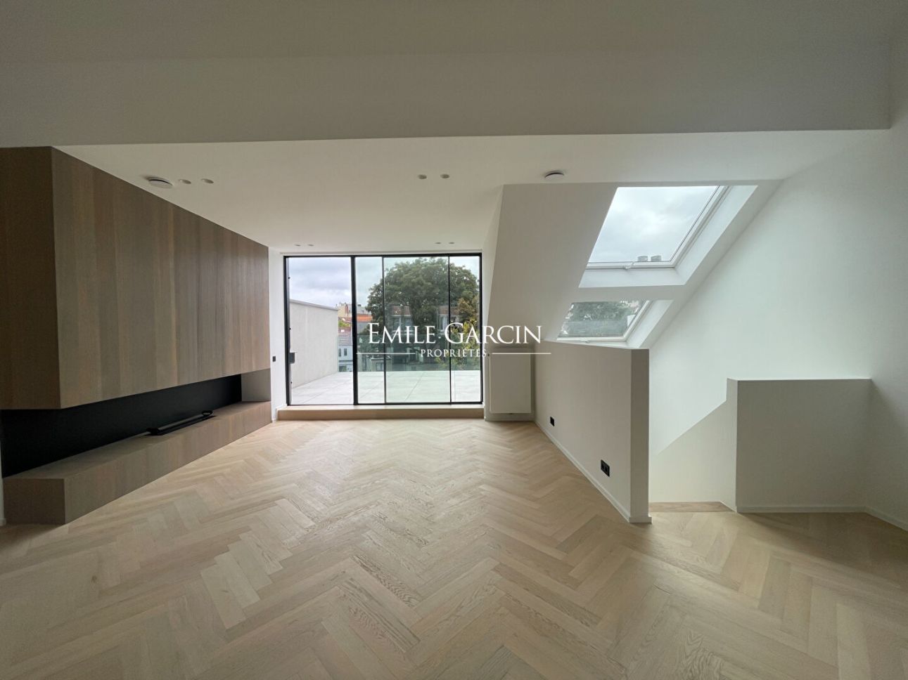 Idéalement situé, à deux pas du Bois de la Cambre, ce superbe penthouse occupe le dernier étage d'un petit immeuble composé de trois unités entièrement rénovées, et offrant des prestations haut de gamme. Développant environ 191 m² (selon PEB), ce duplex inversé séduit par sa magnifique terrasse plein sud d'environ 34 m², baignée de lumière. L'accès se fait via un ascenseur sécurisé menant à un hall d'entrée avec vestiaire et toilette invités. L'espace nuit comprend trois chambres, chacune avec sa salle de bains attenante, un bureau polyvalent ainsi qu'une buanderie. A l'étage supérieur, les élégantes pièces de réception se composent d'un vaste salon ouvert sur la terrasse, d'une cuisine sur mesure avec comptoir dinatoire et d'une salle à manger agrémentée d'un foyer au bioéthanol. PEB : B Visuels d'aménagement fournis à titre informatif et non contractuel.