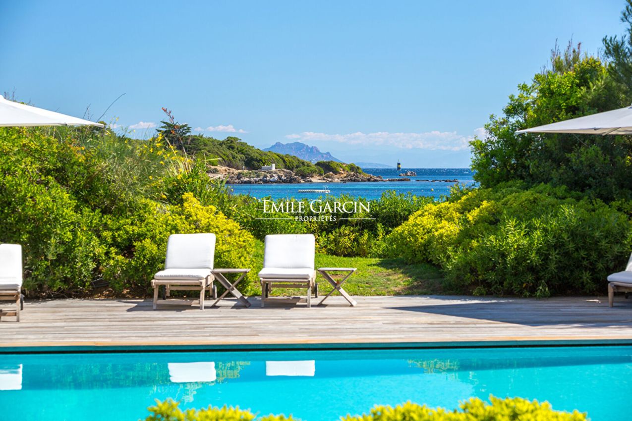 Accès privée direct à la plage. Piscine chauffée et tennis. Encrage d'un bateau possible devant la propriété.
