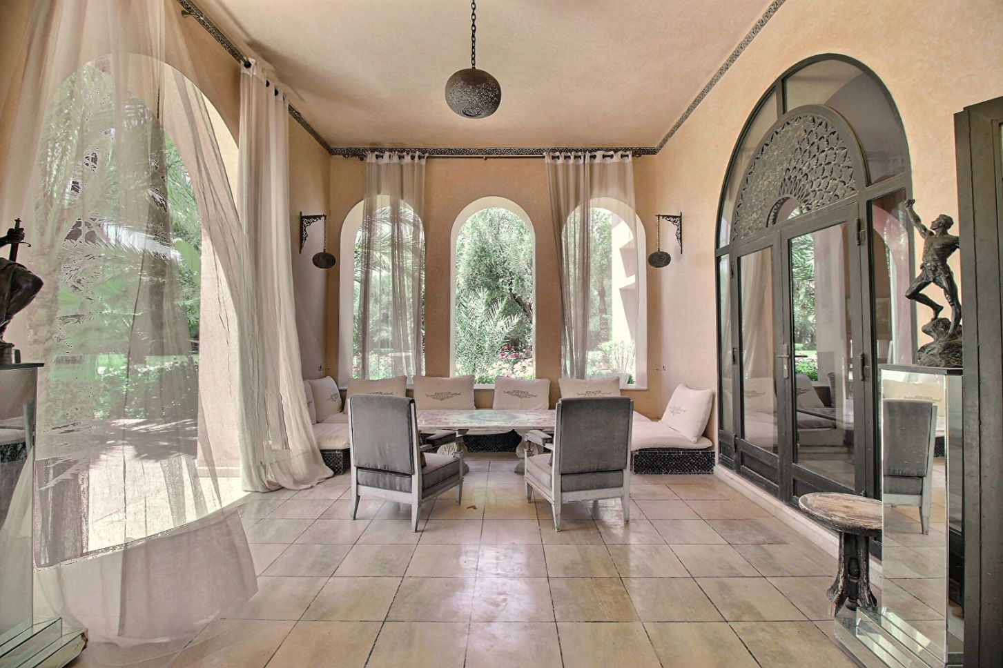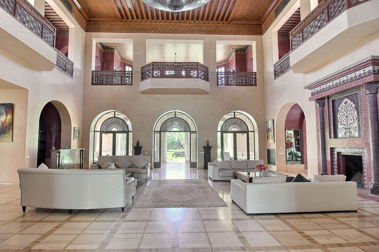 Somptueuse maison de style oriental située au coeur de la Palmeraie, sur un parc arboré d'un hectare. Patio central, belle pièce de réception, un salon cheminée, une salle à manger, ainsi que 5 suites, grande cuisine, nombreuses dépendances, spa et belle piscine.