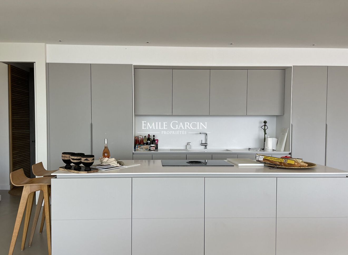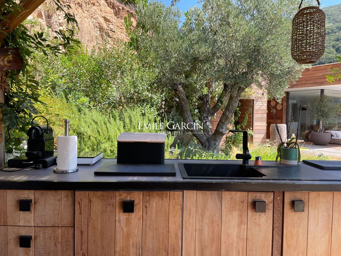 La terrasse entoure toute la maison et offre de nombreux espaces d'intimité : de grands lits en bois pour se relaxer, un espace salon d'été, un coin brasero pour prendre l'apéritif face au soleil couchant, un espace cuisine d'été toute équipée, et sa piscine 14 x 4 m à débordement chauffée et sécurisée par volet électrique, douche extérieure.