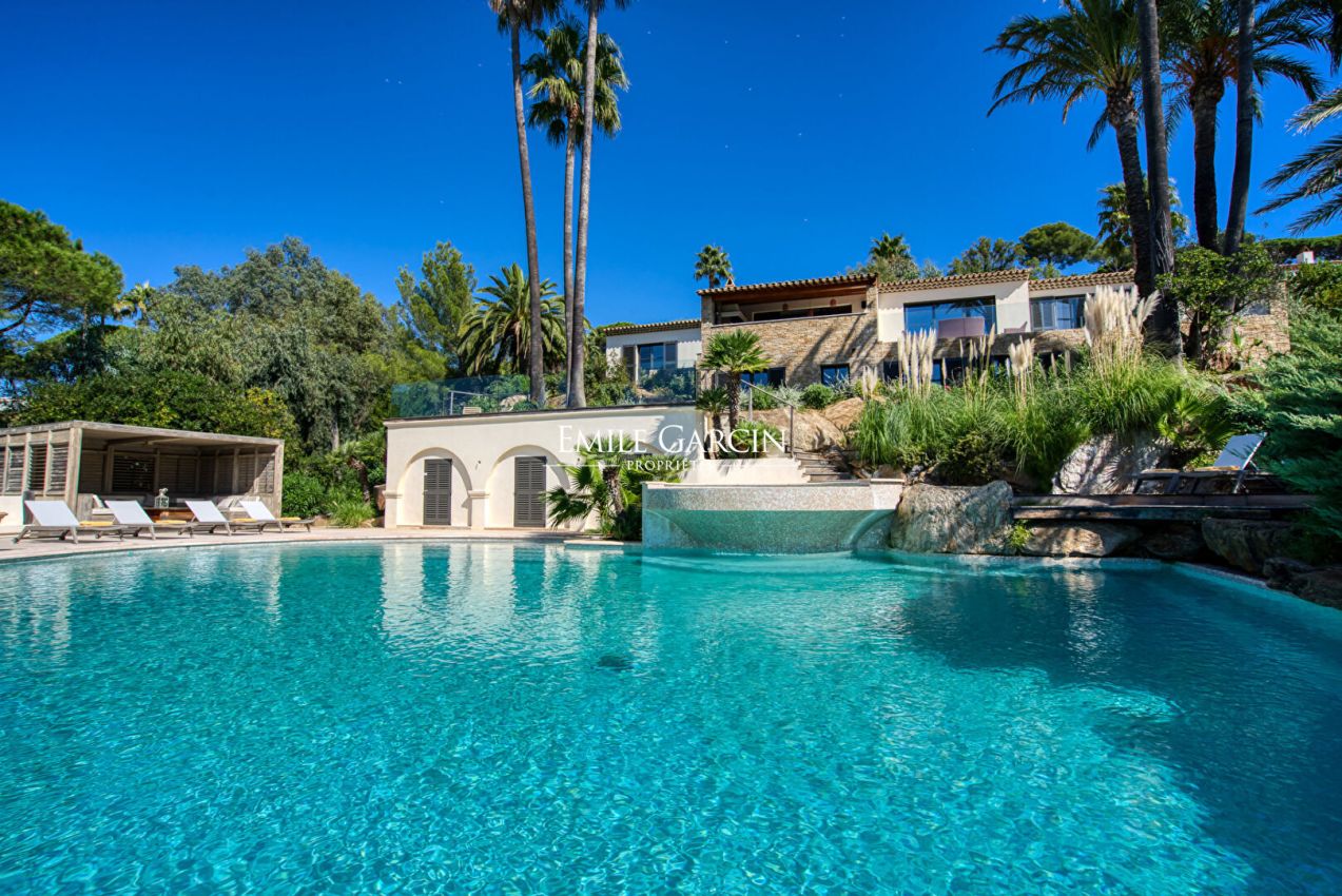 Au coeur d'un domaine calme et sécurisé avec gardien, cette somptueuse villa de 400 m² offre un cadre idyllique alliant élégance, sérénité et confort moderne. Érigée sur un vaste terrain paysager de 3 200 m², elle séduit par sa décoration soignée et ses prestations haut de gamme. Avec ses 5 chambres et 5 salles de bains, cette propriété spacieuse est idéale pour des séjours en famille ou entre amis. Profitez de sa piscine à la forme libre avec bassin de détente, parfaite pour se rafraîchir tout en admirant la vue mer panoramique. Pour des moments de convivialité, un terrain de pétanque et de généreux espaces extérieurs viennent compléter ce cadre enchanteur. Numéro d'enregistrement : 83101 000682 H3