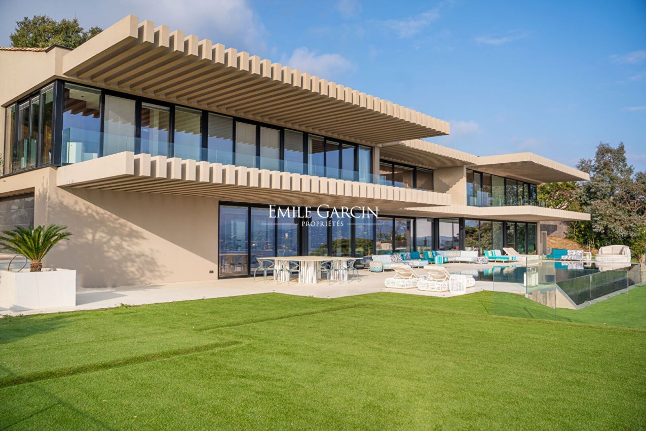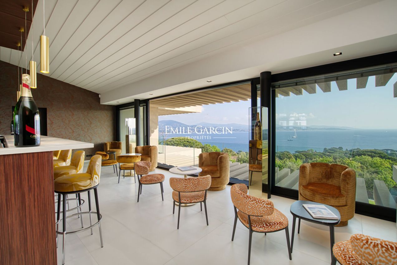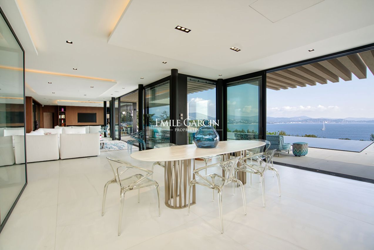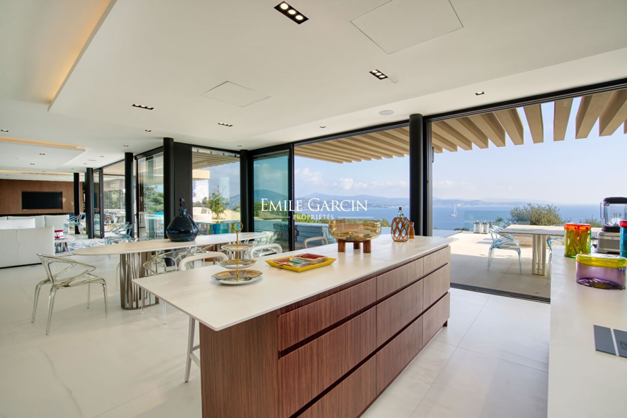 Située dans le domaine de Sinopolis, cette somptueuse propriété moderne offre des prestations haut de gamme et une vue mer panoramique à 180°. Elle se distingue par ses vastes espaces de vie, comprenant un double salon, une salle à manger élégante et une cuisine ouverte avec îlot central, une grande cave à vin et une chambre froide. Lounge/bar à vin à l'étage. Côté nuit, la villa dispose de 5 chambres dans la maison principale ainsi que 3 chambres supplémentaires réparties dans des appartements indépendants, offrant confort et intimité à chaque invité. Pour des instants de détente absolue, profitez d'une piscine chauffée à débordement (15x4m), d'une salle de sport, d'un sauna et d'une salle de massage. Un bien d'exception alliant luxe et sérénité.