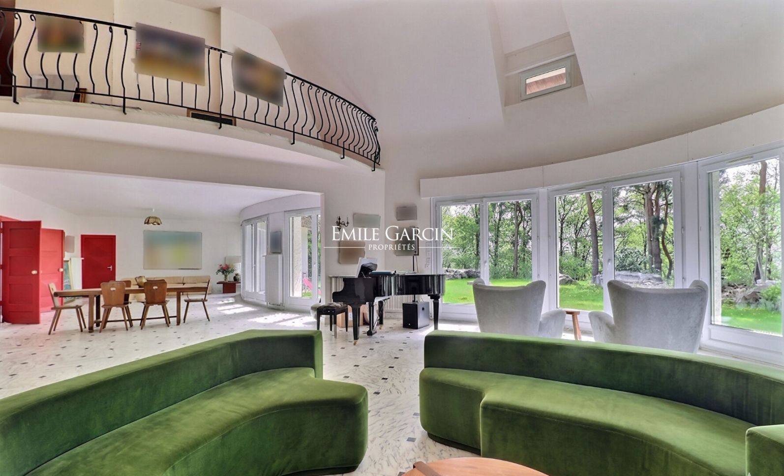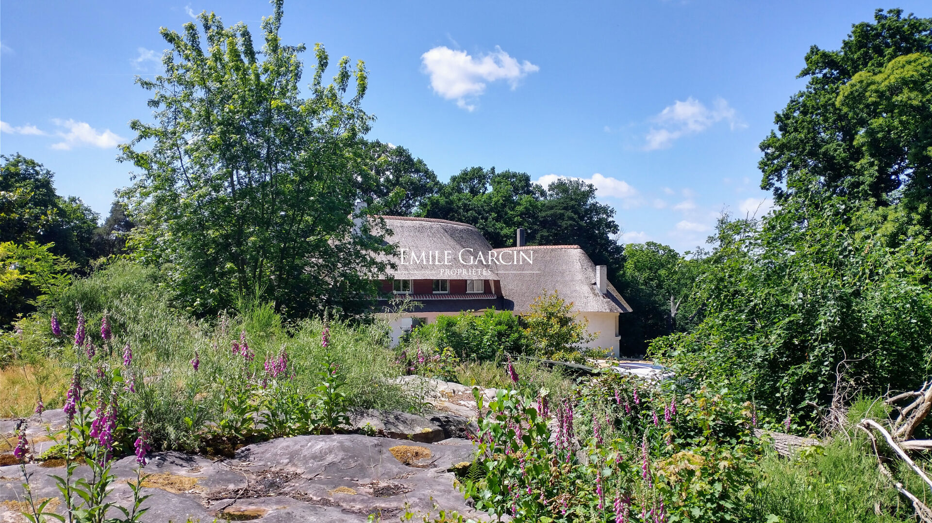 Aux portes de Montfort-l'Amaury, dans un village extrêmement préservé à 35 minutes de Paris par la N12 et l'A13, au coeur d'un parc boisé d'environ 2,6 hectares, en position dominante, se niche cette belle chaumière de la fin des années 60 dont l' architecture, influencée par l'architecture organique typique de la période, privilégie les volumes courbes, la fluidité et la relation au paysage. On ne peut être que séduit par les grands espaces de réception, le calme et la lumière, les 6 chambres dont 2 en rez-de-jardin et le lieu unique où cette maison a été construite. Commerces et écoles sont à moins d'un kilomètre. Gare SNCF à moins de 15 minutes.